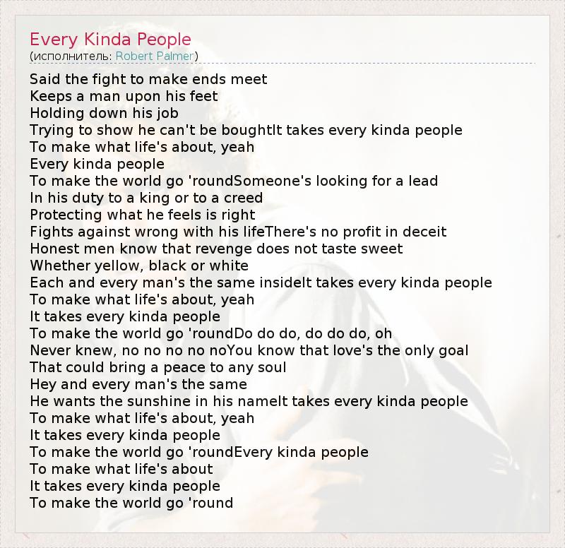 Said the fight to make ends meet Keeps a man upon his feet Holding down his job Trying to show he can't be boughtIt takes every kinda people To make what life's about, yeah Every kinda people To make the world go 'roundSomeone's looking for a lead In his duty to a king or to a creed Protecting what he feels is right Fights against wrong with his lifeThere's no profit in deceit Honest men know that revenge does not taste sweet Whether yellow, black or white Each and every man's the same insideIt takes every kinda people To make what life's about, yeah It takes every kinda people To make the world go 'roundDo do do, do do do, oh Never knew, no no no no noYou know that love's the only goal That could bring a peace to any soul Hey and every man's the same He wants the sunshine in his nameIt takes every kinda people To make what life's about, yeah It takes every kinda people To make the world go 'roundEvery kinda people To make what life's about It takes every kinda people To make the world go 'round