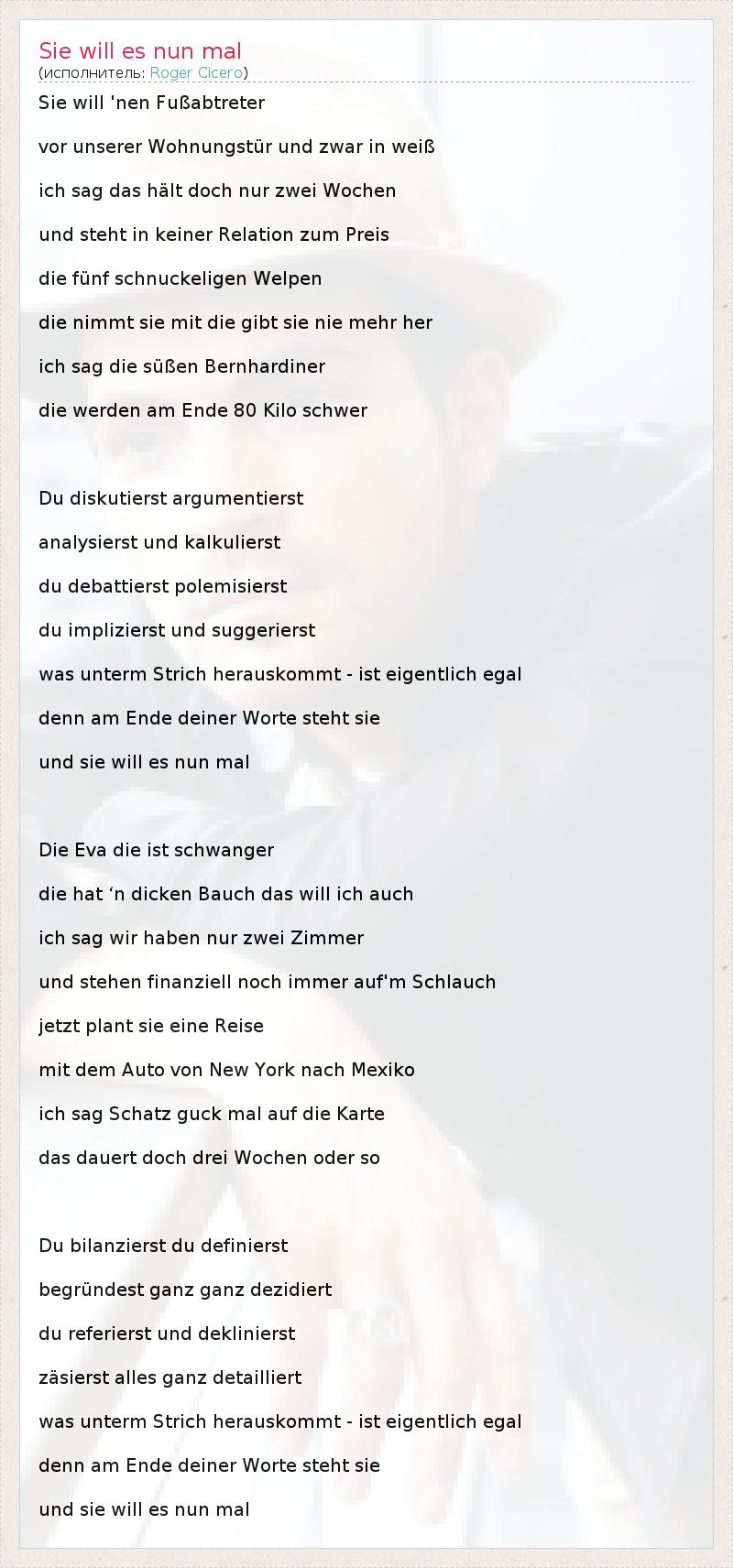 Sie will 'nen Fußabtreter vor unserer Wohnungstür und zwar in weiß ich sag das hält doch nur zwei Wochen und steht in keiner Relation zum Preis die fünf schnuckeligen Welpen die nimmt sie mit die gibt sie nie mehr her ich sag die süßen Bernhardiner die werden am Ende 80 Kilo schwer Du diskutierst argumentierst analysierst und kalkulierst du debattierst polemisierst du implizierst und suggerierst was unterm Strich herauskommt - ist eigentlich egal denn am Ende deiner Worte steht sie und sie will es nun mal Die Eva die ist schwanger die hat ‘n dicken Bauch das will ich auch ich sag wir haben nur zwei Zimmer und stehen finanziell noch immer auf'm Schlauch jetzt plant sie eine Reise mit dem Auto von New York nach Mexiko ich sag Schatz guck mal auf die Karte das dauert doch drei Wochen oder so Du bilanzierst du definierst begründest ganz ganz dezidiert du referierst und deklinierst zäsierst alles ganz detailliert was unterm Strich herauskommt - ist eigentlich egal denn am Ende deiner Worte steht sie und sie will es nun mal