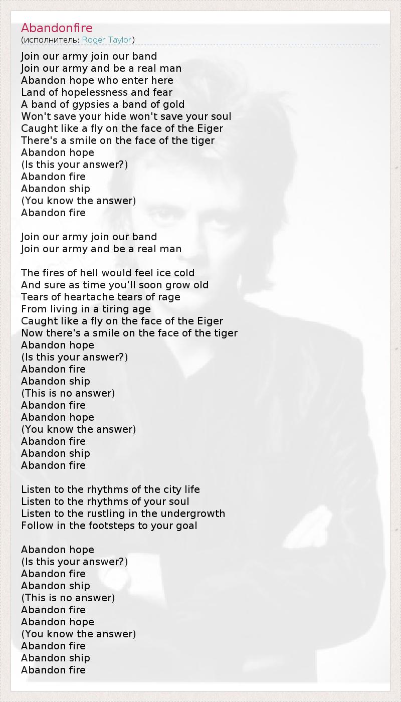 Join our army join our band Join our army and be a real man Abandon hope who enter here Land of hopelessness and fear A band of gypsies a band of gold Won't save your hide won't save your soul Caught like a fly on the face of the Eiger There's a smile on the face of the tiger Abandon hope (Is this your answer?) Abandon fire Abandon ship (You know the answer) Abandon fire Join our army join our band Join our army and be a real man The fires of hell would feel ice cold And sure as time you'll soon grow old Tears of heartache tears of rage From living in a tiring age Caught like a fly on the face of the Eiger Now there's a smile on the face of the tiger Abandon hope (Is this your answer?) Abandon fire Abandon ship (This is no answer) Abandon fire Abandon hope (You know the answer) Abandon fire Abandon ship Abandon fire Listen to the rhythms of the city life Listen to the rhythms of your soul Listen to the rustling in the undergrowth Follow in the footsteps to your goal Abandon hope (Is this your answer?) Abandon fire Abandon ship (This is no answer) Abandon fire Abandon hope (You know the answer) Abandon fire Abandon ship Abandon fire