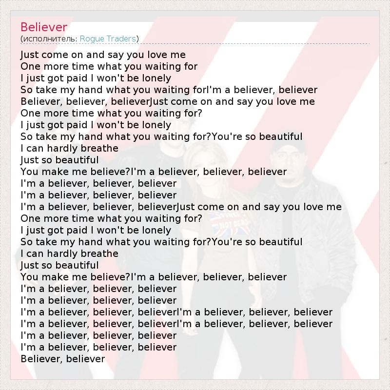 Just come on and say you love me One more time what you waiting for I just got paid I won't be lonely So take my hand what you waiting forI'm a believer, believer Believer, believer, believerJust come on and say you love me One more time what you waiting for? I just got paid I won't be lonely So take my hand what you waiting for?You're so beautiful I can hardly breathe Just so beautiful You make me believe?I'm a believer, believer, believer I'm a believer, believer, believer I'm a believer, believer, believer I'm a believer, believer, believerJust come on and say you love me One more time what you waiting for? I just got paid I won't be lonely So take my hand what you waiting for?You're so beautiful I can hardly breathe Just so beautiful You make me believe?I'm a believer, believer, believer I'm a believer, believer, believer I'm a believer, believer, believer I'm a believer, believer, believerI'm a believer, believer, believer I'm a believer, believer, believerI'm a believer, believer, believer I'm a believer, believer, believer I'm a believer, believer, believer Believer, believer