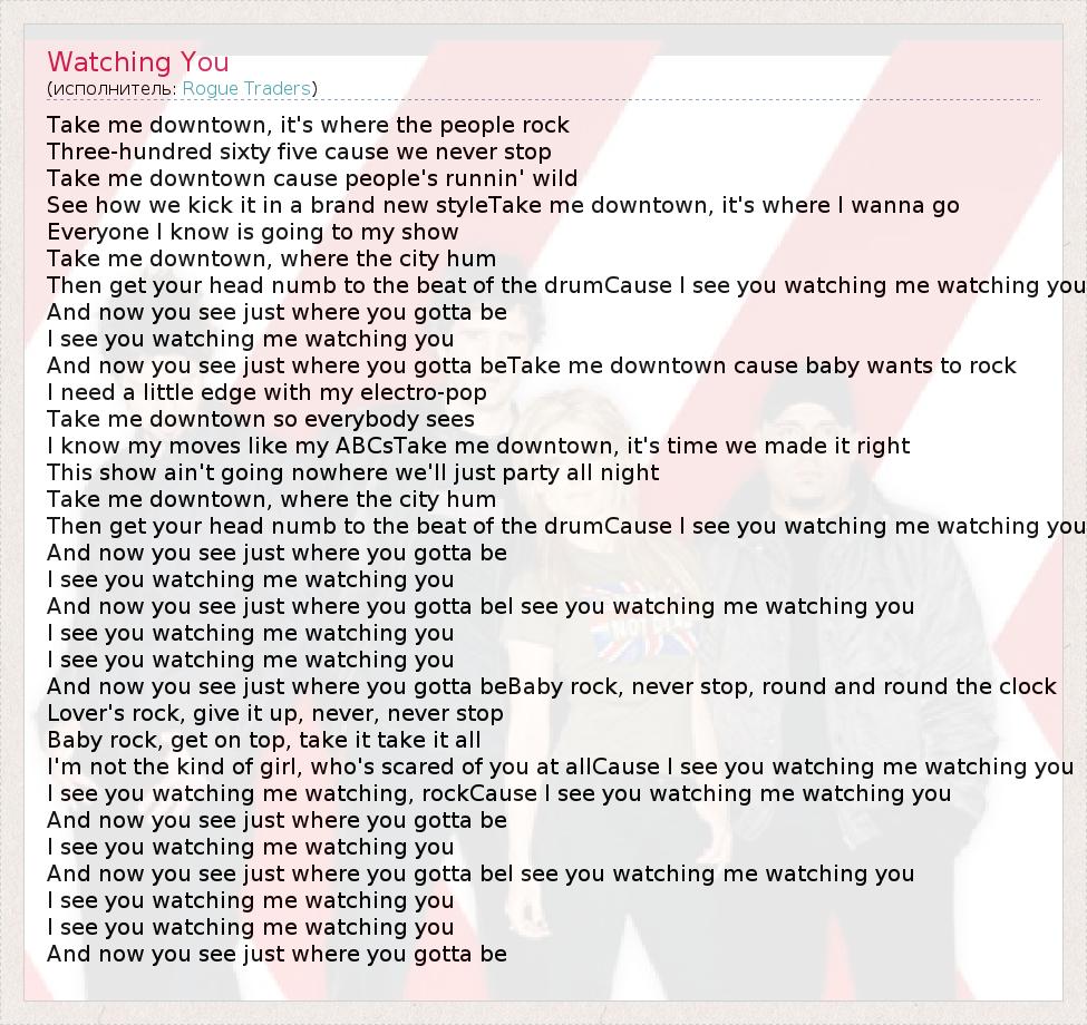 Take me downtown, it's where the people rock Three-hundred sixty five cause we never stop Take me downtown cause people's runnin' wild See how we kick it in a brand new styleTake me downtown, it's where I wanna go Everyone I know is going to my show Take me downtown, where the city hum Then get your head numb to the beat of the drumCause I see you watching me watching you And now you see just where you gotta be I see you watching me watching you And now you see just where you gotta beTake me downtown cause baby wants to rock I need a little edge with my electro-pop Take me downtown so everybody sees I know my moves like my ABCsTake me downtown, it's time we made it right This show ain't going nowhere we'll just party all night Take me downtown, where the city hum Then get your head numb to the beat of the drumCause I see you watching me watching you And now you see just where you gotta be I see you watching me watching you And now you see just where you gotta beI see you watching me watching you I see you watching me watching you I see you watching me watching you And now you see just where you gotta beBaby rock, never stop, round and round the clock Lover's rock, give it up, never, never stop Baby rock, get on top, take it take it all I'm not the kind of girl, who's scared of you at allCause I see you watching me watching you I see you watching me watching, rockCause I see you watching me watching you And now you see just where you gotta be I see you watching me watching you And now you see just where you gotta beI see you watching me watching you I see you watching me watching you I see you watching me watching you And now you see just where you gotta be