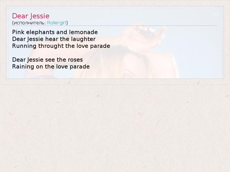 Pink elephants and lemonade Dear Jessie hear the laughter Running throught the love parade Dear Jessie see the roses Raining on the love parade