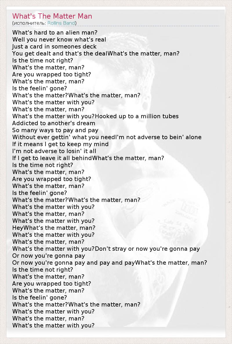 What's hard to an alien man? Well you never know what's real Just a card in someones deck You get dealt and that's the dealWhat's the matter, man? Is the time not right? What's the matter, man? Are you wrapped too tight? What's the matter, man? Is the feelin' gone? What's the matter?What's the matter, man? What's the matter with you? What's the matter, man? What's the matter with you?Hooked up to a million tubes Addicted to another's dream So many ways to pay and pay Without ever gettin' what you needI'm not adverse to bein' alone If it means I get to keep my mind I'm not adverse to losin' it all If I get to leave it all behindWhat's the matter, man? Is the time not right? What's the matter, man? Are you wrapped too tight? What's the matter, man? Is the feelin' gone? What's the matter?What's the matter, man? What's the matter with you? What's the matter, man? What's the matter with you? HeyWhat's the matter, man? What's the matter with you? What's the matter, man? What's the matter with you?Don't stray or now you're gonna pay Or now you're gonna pay Or now you're gonna pay and pay and payWhat's the matter, man? Is the time not right? What's the matter, man? Are you wrapped too tight? What's the matter, man? Is the feelin' gone? What's the matter?What's the matter, man? What's the matter with you? What's the matter, man? What's the matter with you?