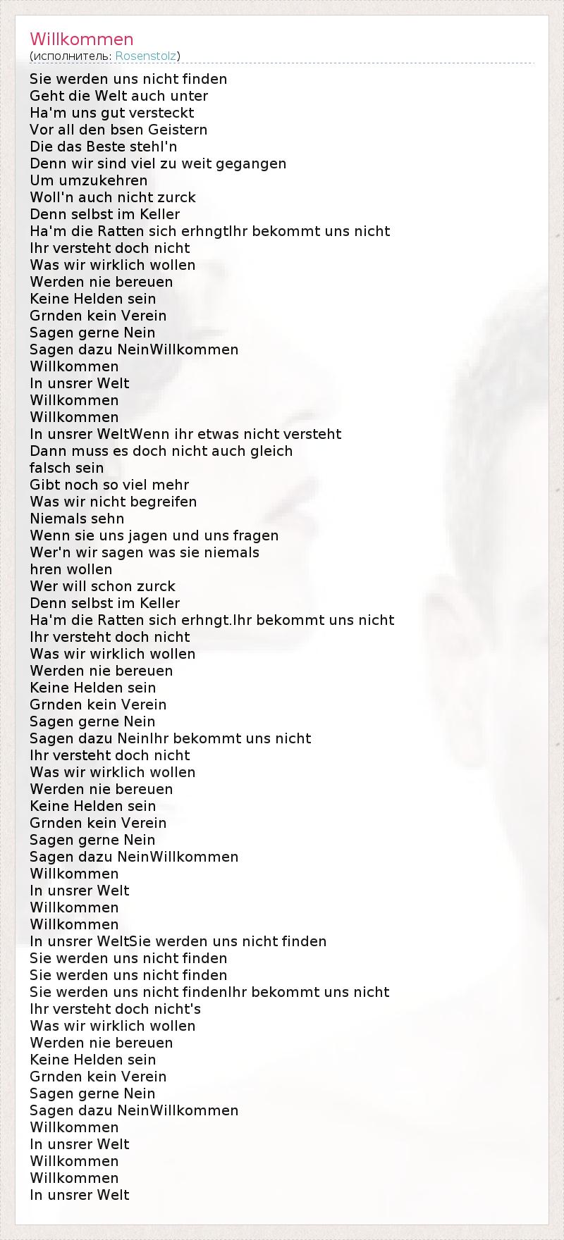 Sie werden uns nicht finden Geht die Welt auch unter Ha'm uns gut versteckt Vor all den bsen Geistern Die das Beste stehl'n Denn wir sind viel zu weit gegangen Um umzukehren Woll'n auch nicht zurck Denn selbst im Keller Ha'm die Ratten sich erhngtIhr bekommt uns nicht Ihr versteht doch nicht Was wir wirklich wollen Werden nie bereuen Keine Helden sein Grnden kein Verein Sagen gerne Nein Sagen dazu NeinWillkommen Willkommen In unsrer Welt Willkommen Willkommen In unsrer WeltWenn ihr etwas nicht versteht Dann muss es doch nicht auch gleich falsch sein Gibt noch so viel mehr Was wir nicht begreifen Niemals sehn Wenn sie uns jagen und uns fragen Wer'n wir sagen was sie niemals hren wollen Wer will schon zurck Denn selbst im Keller Ha'm die Ratten sich erhngt.Ihr bekommt uns nicht Ihr versteht doch nicht Was wir wirklich wollen Werden nie bereuen Keine Helden sein Grnden kein Verein Sagen gerne Nein Sagen dazu NeinIhr bekommt uns nicht Ihr versteht doch nicht Was wir wirklich wollen Werden nie bereuen Keine Helden sein Grnden kein Verein Sagen gerne Nein Sagen dazu NeinWillkommen Willkommen In unsrer Welt Willkommen Willkommen In unsrer WeltSie werden uns nicht finden Sie werden uns nicht finden Sie werden uns nicht finden Sie werden uns nicht findenIhr bekommt uns nicht Ihr versteht doch nicht's Was wir wirklich wollen Werden nie bereuen Keine Helden sein Grnden kein Verein Sagen gerne Nein Sagen dazu NeinWillkommen Willkommen In unsrer Welt Willkommen Willkommen In unsrer Welt
