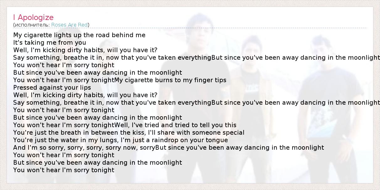 My cigarette lights up the road behind me It's taking me from you Well, I'm kicking dirty habits, will you have it? Say something, breathe it in, now that you've taken everythingBut since you've been away dancing in the moonlight You won't hear I'm sorry tonight But since you've been away dancing in the moonlight You won't hear I'm sorry tonightMy cigarette burns to my finger tips Pressed against your lips Well, I'm kicking dirty habits, will you have it? Say something, breathe it in, now that you've taken everythingBut since you've been away dancing in the moonlight You won't hear I'm sorry tonight But since you've been away dancing in the moonlight You won't hear I'm sorry tonightWell, I've tried and tried to tell you this You're just the breath in between the kiss, I'll share with someone special You're just the water in my lungs, I'm just a raindrop on your tongue And I'm so sorry, sorry, sorry, sorry now, sorryBut since you've been away dancing in the moonlight You won't hear I'm sorry tonight But since you've been away dancing in the moonlight You won't hear I'm sorry tonight