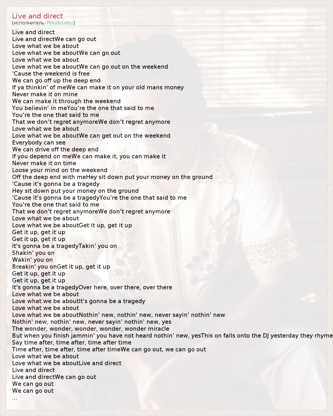 Live and direct Live and directWe can go out Love what we be about Love what we be aboutWe can go out Love what we be about Love what we be aboutWe can go out on the weekend 'Cause the weekend is free We can go off up the deep end If ya thinkin' of meWe can make it on your old mans money Never make it on mine We can make it through the weekend You believin' in meYou're the one that said to me You're the one that said to me That we don't regret anymoreWe don't regret anymore Love what we be about Love what we be aboutWe can get out on the weekend Everybody can see We can drive off the deep end If you depend on meWe can make it, you can make it Never make it on time Loose your mind on the weekend Off the deep end with meHey sit down put your money on the ground 'Cause it's gonna be a tragedy Hey sit down put your money on the ground 'Cause it's gonna be a tragedyYou're the one that said to me You're the one that said to me That we don't regret anymoreWe don't regret anymore Love what we be about Love what we be aboutGet it up, get it up Get it up, get it up Get it up, get it up It's gonna be a tragedyTakin' you on Shakin' you on Wakin' you on Breakin' you onGet it up, get it up Get it up, get it up Get it up, get it up It's gonna be a tragedyOver here, over there, over there Love what we be about Love what we be aboutIt's gonna be a tragedy Love what we be about Love what we be aboutNothin' new, nothin' new, never sayin' nothin' new Nothin' new, nothin' new, never sayin' nothin' new, yes The wonder, wonder, wonder, wonder, wonder miracle But when you finish jammin' you have not heard nothin' new, yesThis on falls onto the DJ yesterday they rhyme Say time after, time after, time after time Time after, time after, time after timeWe can go out, we can go out Love what we be about Love what we be aboutLive and direct Live and direct Live and directWe can go out We can go out We can go out ...