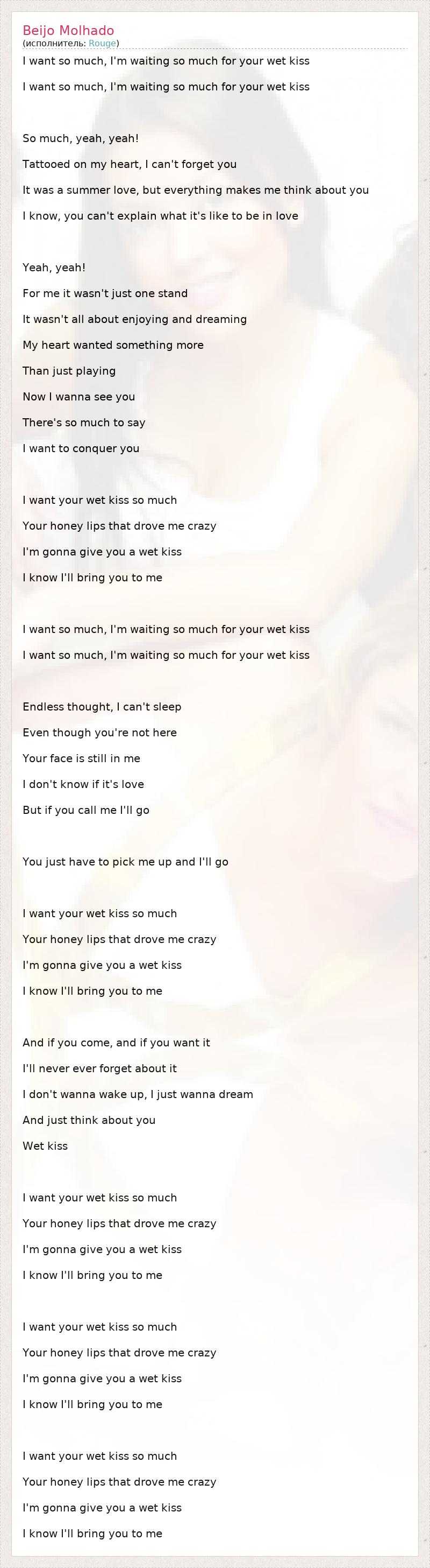 I want so much, I'm waiting so much for your wet kiss I want so much, I'm waiting so much for your wet kiss So much, yeah, yeah! Tattooed on my heart, I can't forget you It was a summer love, but everything makes me think about you I know, you can't explain what it's like to be in love Yeah, yeah! For me it wasn't just one stand It wasn't all about enjoying and dreaming My heart wanted something more Than just playing Now I wanna see you There's so much to say I want to conquer you I want your wet kiss so much Your honey lips that drove me crazy I'm gonna give you a wet kiss I know I'll bring you to me I want so much, I'm waiting so much for your wet kiss I want so much, I'm waiting so much for your wet kiss Endless thought, I can't sleep Even though you're not here Your face is still in me I don't know if it's love But if you call me I'll go You just have to pick me up and I'll go I want your wet kiss so much Your honey lips that drove me crazy I'm gonna give you a wet kiss I know I'll bring you to me And if you come, and if you want it I'll never ever forget about it I don't wanna wake up, I just wanna dream And just think about you Wet kiss I want your wet kiss so much Your honey lips that drove me crazy I'm gonna give you a wet kiss I know I'll bring you to me I want your wet kiss so much Your honey lips that drove me crazy I'm gonna give you a wet kiss I know I'll bring you to me I want your wet kiss so much Your honey lips that drove me crazy I'm gonna give you a wet kiss I know I'll bring you to me