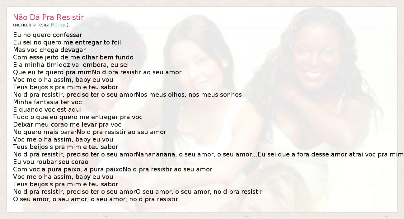 Eu no quero confessar Eu sei no quero me entregar to fcil Mas voc chega devagar Com esse jeito de me olhar bem fundo E a minha timidez vai embora, eu sei Que eu te quero pra mimNo d pra resistir ao seu amor Voc me olha assim, baby eu vou Teus beijos s pra mim e teu sabor No d pra resistir, preciso ter o seu amorNos meus olhos, nos meus sonhos Minha fantasia ter voc E quando voc est aqui Tudo o que eu quero me entregar pra voc Deixar meu corao me levar pra voc No quero mais pararNo d pra resistir ao seu amor Voc me olha assim, baby eu vou Teus beijos s pra mim e teu sabor No d pra resistir, preciso ter o seu amorNanananana, o seu amor, o seu amor...Eu sei que a fora desse amor atrai voc pra mim Eu vou roubar seu corao Com voc a pura paixo, a pura paixoNo d pra resistir ao seu amor Voc me olha assim, baby eu vou Teus beijos s pra mim e teu sabor No d pra resistir, preciso ter o seu amorO seu amor, o seu amor, no d pra resistir O seu amor, o seu amor, o seu amor, no d pra resistir