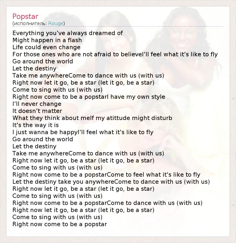 Everything you've always dreamed of Might happen in a flash Life could even change For those ones who are not afraid to believeI'll feel what it's like to fly Go around the world Let the destiny Take me anywhereCome to dance with us (with us) Right now let it go, be a star (let it go, be a star) Come to sing with us (with us) Right now come to be a popstarI have my own style I'll never change It doesn't matter What they think about meIf my atittude might disturb It's the way it is I just wanna be happyI'll feel what it's like to fly Go around the world Let the destiny Take me anywhereCome to dance with us (with us) Right now let it go, be a star (let it go, be a star) Come to sing with us (with us) Right now come to be a popstarCome to feel what it's like to fly Let the destiny take you anywhereCome to dance with us (with us) Right now let it go, be a star (let it go, be a star) Come to sing with us (with us) Right now come to be a popstarCome to dance with us (with us) Right now let it go, be a star (let it go, be a star) Come to sing with us (with us) Right now come to be a popstar