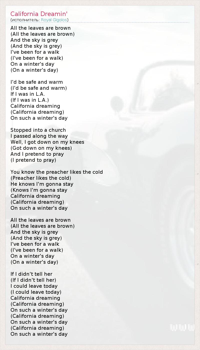 Все листья коричневые (2 р.) И небо серое (2 р.) Я гулял (2 р.) Зимним днем. (2 р.) Я был бы в тепле и покое (2 р.) Если бы я в Лос-Анджелесе. (2 р.) Сказочная Калифорния (2 р.) Этим зимним днем. Я шел по дороге И остановился в церкви. Я встал на колени (2 р.) И притворился, что молюсь. Ты знаешь, проповедник любит холод (2 р.) Он знает, что я собираюсь стоять, (2 р.) Сказочная Калифорния (2 р.) Этим зимним днем. Все листья коричневые (2 р.) И небо серое (2 р.) Я гулял (2 р.) Зимним днем. (2 р.) Если я не скажу ей (2 р.) Я уеду сегодня (2 р.) Из сказочной Калифорнии В этот зимний день, (2 р.) В этот зимний день (2 р.) В этот зимний день (2 р.)