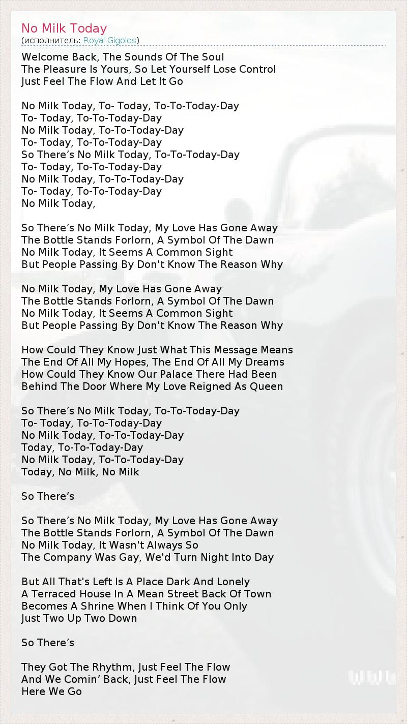 Welcome Back, The Sounds Of The Soul The Pleasure Is Yours, So Let Yourself Lose Control Just Feel The Flow And Let It Go No Milk Today, To- Today, To-To-Today-Day To- Today, To-To-Today-Day No Milk Today, To-To-Today-Day To- Today, To-To-Today-Day So There’s No Milk Today, To-To-Today-Day To- Today, To-To-Today-Day No Milk Today, To-To-Today-Day To- Today, To-To-Today-Day No Milk Today, So There’s No Milk Today, My Love Has Gone Away The Bottle Stands Forlorn, A Symbol Of The Dawn No Milk Today, It Seems A Common Sight But People Passing By Don't Know The Reason Why No Milk Today, My Love Has Gone Away The Bottle Stands Forlorn, A Symbol Of The Dawn No Milk Today, It Seems A Common Sight But People Passing By Don't Know The Reason Why How Could They Know Just What This Message Means The End Of All My Hopes, The End Of All My Dreams How Could They Know Our Palace There Had Been Behind The Door Where My Love Reigned As Queen So There’s No Milk Today, To-To-Today-Day To- Today, To-To-Today-Day No Milk Today, To-To-Today-Day Today, To-To-Today-Day No Milk Today, To-To-Today-Day Today, No Milk, No Milk So There’s So There’s No Milk Today, My Love Has Gone Away The Bottle Stands Forlorn, A Symbol Of The Dawn No Milk Today, It Wasn't Always So The Company Was Gay, We'd Turn Night Into Day But All That's Left Is A Place Dark And Lonely A Terraced House In A Mean Street Back Of Town Becomes A Shrine When I Think Of You Only Just Two Up Two Down So There’s They Got The Rhythm, Just Feel The Flow And We Comin’ Back, Just Feel The Flow Here We Go