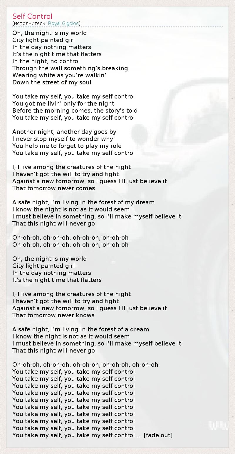 Oh, the night is my world City light painted girl In the day nothing matters It's the night time that flatters In the night, no control Through the wall something's breaking Wearing white as you're walkin' Down the street of my soul You take my self, you take my self control You got me livin' only for the night Before the morning comes, the story's told You take my self, you take my self control Another night, another day goes by I never stop myself to wonder why You help me to forget to play my role You take my self, you take my self control I, I live among the creatures of the night I haven't got the will to try and fight Against a new tomorrow, so I guess I'll just believe it That tomorrow never comes A safe night, I'm living in the forest of my dream I know the night is not as it would seem I must believe in something, so I'll make myself believe it That this night will never go Oh-oh-oh, oh-oh-oh, oh-oh-oh, oh-oh-oh Oh-oh-oh, oh-oh-oh, oh-oh-oh, oh-oh-oh Oh, the night is my world City light painted girl In the day nothing matters It's the night time that flatters I, I live among the creatures of the night I haven't got the will to try and fight Against a new tomorrow, so I guess I'll just believe it That tomorrow never knows A safe night, I'm living in the forest of a dream I know the night is not as it would seem I must believe in something, so I'll make myself believe it That this night will never go Oh-oh-oh, oh-oh-oh, oh-oh-oh, oh-oh-oh, oh-oh-oh You take my self, you take my self control You take my self, you take my self control You take my self, you take my self control You take my self, you take my self control You take my self, you take my self control You take my self, you take my self control You take my self, you take my self control You take my self, you take my self control You take my self, you take my self control You take my self, you take my self control ... [fade out]