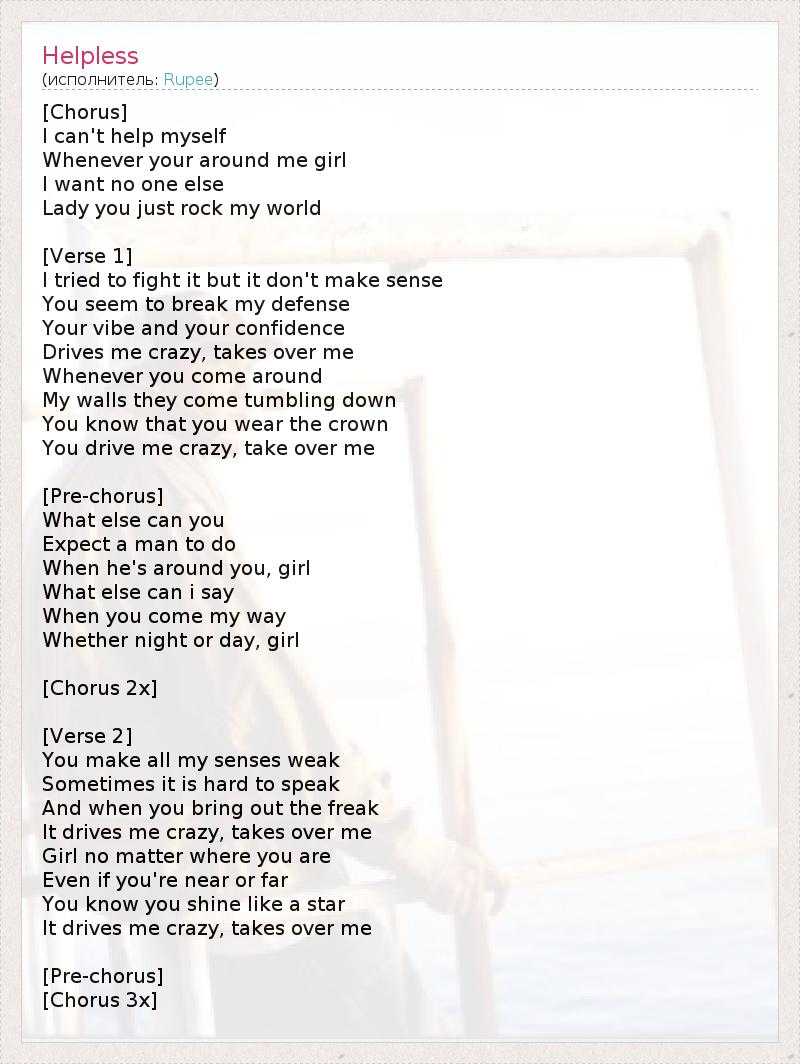 [Chorus] I can't help myself Whenever your around me girl I want no one else Lady you just rock my world [Verse 1] I tried to fight it but it don't make sense You seem to break my defense Your vibe and your confidence Drives me crazy, takes over me Whenever you come around My walls they come tumbling down You know that you wear the crown You drive me crazy, take over me [Pre-chorus] What else can you Expect a man to do When he's around you, girl What else can i say When you come my way Whether night or day, girl [Chorus 2x] [Verse 2] You make all my senses weak Sometimes it is hard to speak And when you bring out the freak It drives me crazy, takes over me Girl no matter where you are Even if you're near or far You know you shine like a star It drives me crazy, takes over me [Pre-chorus] [Chorus 3x]