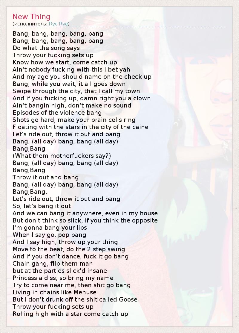 Bang, bang, bang, bang, bang Bang, bang, bang, bang, bang Do what the song says Throw your fucking sets up Know how we start, come catch up Ain't nobody fucking with this I bet yah And my age you should name on the check up Bang, while you wait, it all goes down Swipe through the city, that I call my town And if you fucking up, damn right you a clown Ain't bangin high, don't make no sound Episodes of the violence bang Shots go hard, make your brain cells ring Floating with the stars in the city of the caine Let's ride out, throw it out and bang Bang, (all day) bang, bang (all day) Bang,Bang (What them motherfuckers say?) Bang, (all day) bang, bang (all day) Bang,Bang Throw it out and bang Bang, (all day) bang, bang (all day) Bang,Bang, Let's ride out, throw it out and bang So, let's bang it out And we can bang it anywhere, even in my house But don't think so slick, if you think the opposite I'm gonna bang your lips When I say go, pop bang And I say high, throw up your thing Move to the beat, do the 2 step swing And if you don't dance, fuck it go bang Chain gang, flip them man but at the parties slick'd insane Princess a diss, so bring my name Try to come near me, then shit go bang Living in chains like Menuse But I don't drunk off the shit called Goose Throw your fucking sets up Rolling high with a star come catch up