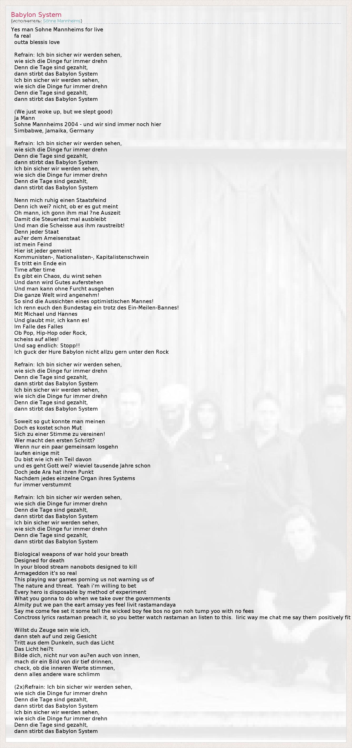 Yes man Sohne Mannheims for live fa real outta blessis love Refrain: Ich bin sicher wir werden sehen, wie sich die Dinge fur immer drehn Denn die Tage sind gezahlt, dann stirbt das Babylon System Ich bin sicher wir werden sehen, wie sich die Dinge fur immer drehn Denn die Tage sind gezahlt, dann stirbt das Babylon System (We just woke up, but we slept good) Ja Mann Sohne Mannheims 2004 - und wir sind immer noch hier Simbabwe, Jamaika, Germany Refrain: Ich bin sicher wir werden sehen, wie sich die Dinge fur immer drehn Denn die Tage sind gezahlt, dann stirbt das Babylon System Ich bin sicher wir werden sehen, wie sich die Dinge fur immer drehn Denn die Tage sind gezahlt, dann stirbt das Babylon System Nenn mich ruhig einen Staatsfeind Denn ich wei? nicht, ob er es gut meint Oh mann, ich gonn ihm mal ?ne Auszeit Damit die Steuerlast mal ausbleibt Und man die Scheisse aus ihm raustreibt! Denn jeder Staat au?er dem Ameisenstaat ist mein Feind Hier ist jeder gemeint Kommunisten-, Nationalisten-, Kapitalistenschwein Es tritt ein Ende ein Time after time Es gibt ein Chaos, du wirst sehen Und dann wird Gutes auferstehen Und man kann ohne Furcht ausgehen Die ganze Welt wird angenehm! So sind die Aussichten eines optimistischen Mannes! Ich renn euch den Bundestag ein trotz des Ein-Meilen-Bannes! Mit Michael und Hannes Und glaubt mir, ich kann es! Im Falle des Falles Ob Pop, Hip-Hop oder Rock, scheiss auf alles! Und sag endlich: Stopp!! Ich guck der Hure Babylon nicht allzu gern unter den Rock Refrain: Ich bin sicher wir werden sehen, wie sich die Dinge fur immer drehn Denn die Tage sind gezahlt, dann stirbt das Babylon System Ich bin sicher wir werden sehen, wie sich die Dinge fur immer drehn Denn die Tage sind gezahlt, dann stirbt das Babylon System Soweit so gut konnte man meinen Doch es kostet schon Mut Sich zu einer Stimme zu vereinen! Wer macht den ersten Schritt? Wenn nur ein paar gemeinsam losgehn laufen einige mit Du bist wie ich ein Teil davon und es geht Gott wei? wieviel tausende Jahre schon Doch jede Ara hat ihren Punkt Nachdem jedes einzelne Organ ihres Systems fur immer verstummt Refrain: Ich bin sicher wir werden sehen, wie sich die Dinge fur immer drehn Denn die Tage sind gezahlt, dann stirbt das Babylon System Ich bin sicher wir werden sehen, wie sich die Dinge fur immer drehn Denn die Tage sind gezahlt, dann stirbt das Babylon System Biological weapons of war hold your breath Designed for death In your blood stream nanobots designed to kill Armageddon it's so real This playing war games porning us not warning us of The nature and threat. Yeah i'm willing to bet Every hero is disposable by method of experiment What you gonna to do when we take over the governments Almity put we pan the eart amsay yes feel livit rastamandaya Say me come fee set it some tell the wicked boy fee bos no gon noh tump yoo with no fees Conctross lyrics rastaman preach it, so you better watch rastaman an listen to this. liric way me chat me say them positively fit Willst du Zeuge sein wie ich, dann steh auf und zeig Gesicht Tritt aus dem Dunkeln, such das Licht Das Licht hei?t Bilde dich, nicht nur von au?en auch von innen, mach dir ein Bild von dir tief drinnen, check, ob die inneren Werte stimmen, denn alles andere ware schlimm (2x)Refrain: Ich bin sicher wir werden sehen, wie sich die Dinge fur immer drehn Denn die Tage sind gezahlt, dann stirbt das Babylon System Ich bin sicher wir werden sehen, wie sich die Dinge fur immer drehn Denn die Tage sind gezahlt, dann stirbt das Babylon System