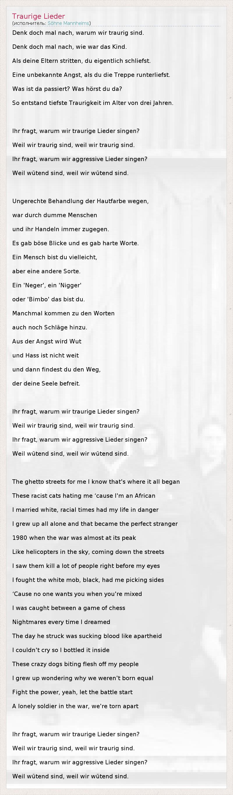 Denk doch mal nach, warum wir traurig sind. Denk doch mal nach, wie war das Kind. Als deine Eltern stritten, du eigentlich schliefst. Eine unbekannte Angst, als du die Treppe runterliefst. Was ist da passiert? Was hörst du da? So entstand tiefste Traurigkeit im Alter von drei Jahren. Ihr fragt, warum wir traurige Lieder singen? Weil wir traurig sind, weil wir traurig sind. Ihr fragt, warum wir aggressive Lieder singen? Weil wütend sind, weil wir wütend sind. Ungerechte Behandlung der Hautfarbe wegen, war durch dumme Menschen und ihr Handeln immer zugegen. Es gab böse Blicke und es gab harte Worte. Ein Mensch bist du vielleicht, aber eine andere Sorte. Ein 'Neger', ein 'Nigger' oder 'Bimbo' das bist du. Manchmal kommen zu den Worten auch noch Schläge hinzu. Aus der Angst wird Wut und Hass ist nicht weit und dann findest du den Weg, der deine Seele befreit. Ihr fragt, warum wir traurige Lieder singen? Weil wir traurig sind, weil wir traurig sind. Ihr fragt, warum wir aggressive Lieder singen? Weil wütend sind, weil wir wütend sind. The ghetto streets for me I know that's where it all began These racist cats hating me ‘cause I'm an African I married white, racial times had my life in danger I grew up all alone and that became the perfect stranger 1980 when the war was almost at its peak Like helicopters in the sky, coming down the streets I saw them kill a lot of people right before my eyes I fought the white mob, black, had me picking sides ‘Cause no one wants you when you're mixed I was caught between a game of chess Nightmares every time I dreamed The day he struck was sucking blood like apartheid I couldn't cry so I bottled it inside These crazy dogs biting flesh off my people I grew up wondering why we weren't born equal Fight the power, yeah, let the battle start A lonely soldier in the war, we're torn apart Ihr fragt, warum wir traurige Lieder singen? Weil wir traurig sind, weil wir traurig sind. Ihr fragt, warum wir aggressive Lieder singen? Weil wütend sind, weil wir wütend sind.