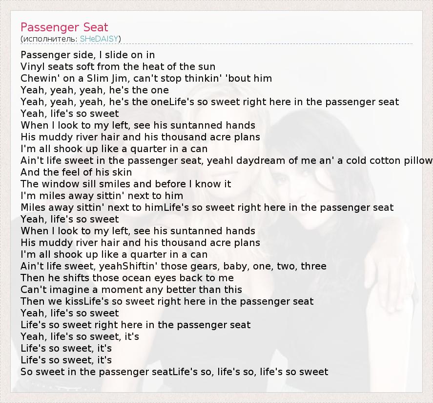 А как ты думаешь, о чем песня "Passenger Seat" ?