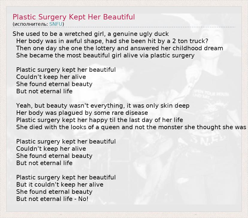 А как ты думаешь, о чем песня "Plastic Surgery Kept Her Beautiful" ?