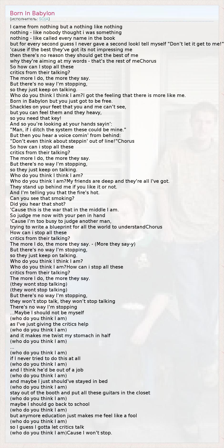 I came from nothing but a nothing like nothing nothing - like nobody thought i was something nothing - like called every name in the book but for every second guess I never gave a second lookI tell myself "Don't let it get to me!" 'cause if the best they've got its not impressing me then there's no reason they should get the best of me why they're aiming at my words - that's the rest of meChorus So how can I stop all these critics from their talking? The more I do, the more they say. But there's no way I'm stopping, so they just keep on talking. Who do you think I think I am?I got the feeling that there is more like me. Born in Babylon but you just got to be free. Shackles on your feet that you and me can't see, but you can feel them and they heavy, so you need that key! And so you're looking at your hands sayin': "Man, if i ditch the system these could be mine." But then you hear a voice comin' from behind: "Don't even think about steppin' out of line!"Chorus So how can i stop all these critics from their talking? The more I do, the more they say. But there's no way I'm stopping, so they just keep on talking. Who do you think I think I am? Who do you think I am?My friends are deep and they're all I've got. They stand up behind me if you like it or not. And I'm telling you that the fire's hot. Can you see that smoking? Did you hear that shot? 'Cause this is the war that in the middle I am. So judge me now with your pen in hand 'Cause I'm too busy to judge another man, trying to write a blueprint for all the world to understandChorus How can i stop all these critics from their talking? The more I do, the more they say. - (More they say-y) But there's no way I'm stopping, so they just keep on talking. Who do you think I think I am? Who do you think I am?How can i stop all these critics from their talking? The more I do, the more they say. (they wont stop talking) (they wont stop talking) But there's no way I'm stopping, they won't stop talk, they won't stop talking There's no way I'm stopping ...Maybe I should not be myself (who do you think I am) as I've just giving the critics help (who do you think I am) and it makes me twist my stomach in half (who do you think I am) ... (who do you think I am) if I never tried to do this at all (who do you think I am) and I think he'd be out of a job (who do you think I am) and maybe I just should've stayed in bed (who do you think I am) stay out of the booth and put all these guitars in the closet (who do you think I am) maybe I should go back to school (who do you think I am) but anymore education just makes me feel like a fool (who do you think I am) so I guess I gotta let critics talk (who do you think I am)Cause I won't stop.
