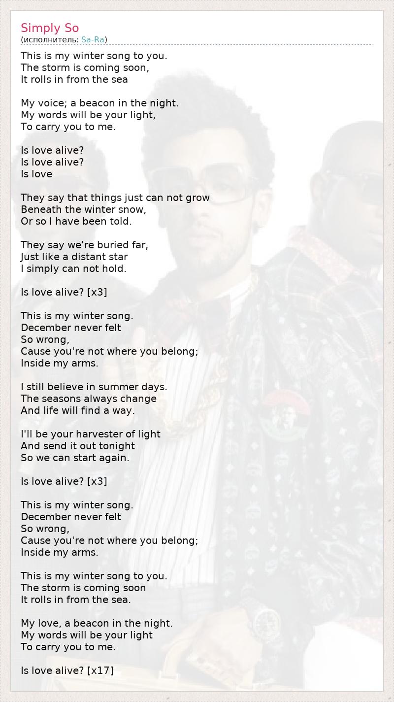 Это моя зимняя песня для тебя. Скоро начнется метель. Она катится с моря. Мой голос - маяк в ночи, Мои слова станут светом для тебя, Чтобы привести тебя ко мне. Любовь жива? Любовь жива? Любовь...? Говорят, ничего не может вырасти Под снегом зимы, Или так мне сказали. Говорят, мы скрыты далеко под снегом, Совсем как далекие звезды. Я просто не могу держаться. Любовь жива? [x3] Это моя зимняя песня. Декабрь еще никогда не казался мне Таким несправедливым, Потому что ты не там, где тебе место, - В моих объятиях. Я все еще верю в летние дни. Времена года всегда сменяют друг друга, И жизнь найдет путь. Я буду собирать для тебя свет И излучать его сегодня вечером. Так что мы можем начать заново. Любовь жива? [x3] Это моя зимняя песня. Декабрь еще никогда не казался мне Таким несправедливым, Потому что ты не там, где тебе место, - В моих объятиях. Это моя зимняя песня для тебя. Скоро начнется метель. Она надвигается с моря. Моя любовь - маяк в ночи, Мои слова станут светом для тебя, Чтобы привести тебя ко мне. Любовь жива? [x17]