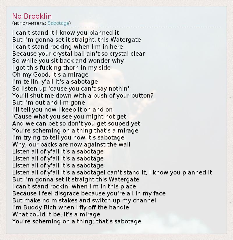 I can't stand it I know you planned it But I'm gonna set it straight, this Watergate I can't stand rocking when I'm in here Because your crystal ball ain't so crystal clear So while you sit back and wonder why I got this fucking thorn in my side Oh my Good, it's a mirage I'm tellin' y'all it's a sabotage So listen up 'cause you can't say nothin' You'll shut me down with a push of your button? But I'm out and I'm gone I'll tell you now I keep it on and on 'Cause what you see you might not get And we can bet so don't you get souped yet You're scheming on a thing that's a mirage I'm trying to tell you now it's sabotage Why; our backs are now against the wall Listen all of y'all it's a sabotage Listen all of y'all it's a sabotage Listen all of y'all it's a sabotage Listen all of y'all it's a sabotageI can't stand it, I know you planned it But I'm gonna set it straight this Watergate I can't stand rockin' when I'm in this place Because I feel disgrace because you're all in my face But make no mistakes and switch up my channel I'm Buddy Rich when I fly off the handle What could it be, it's a mirage You're scheming on a thing; that's sabotage