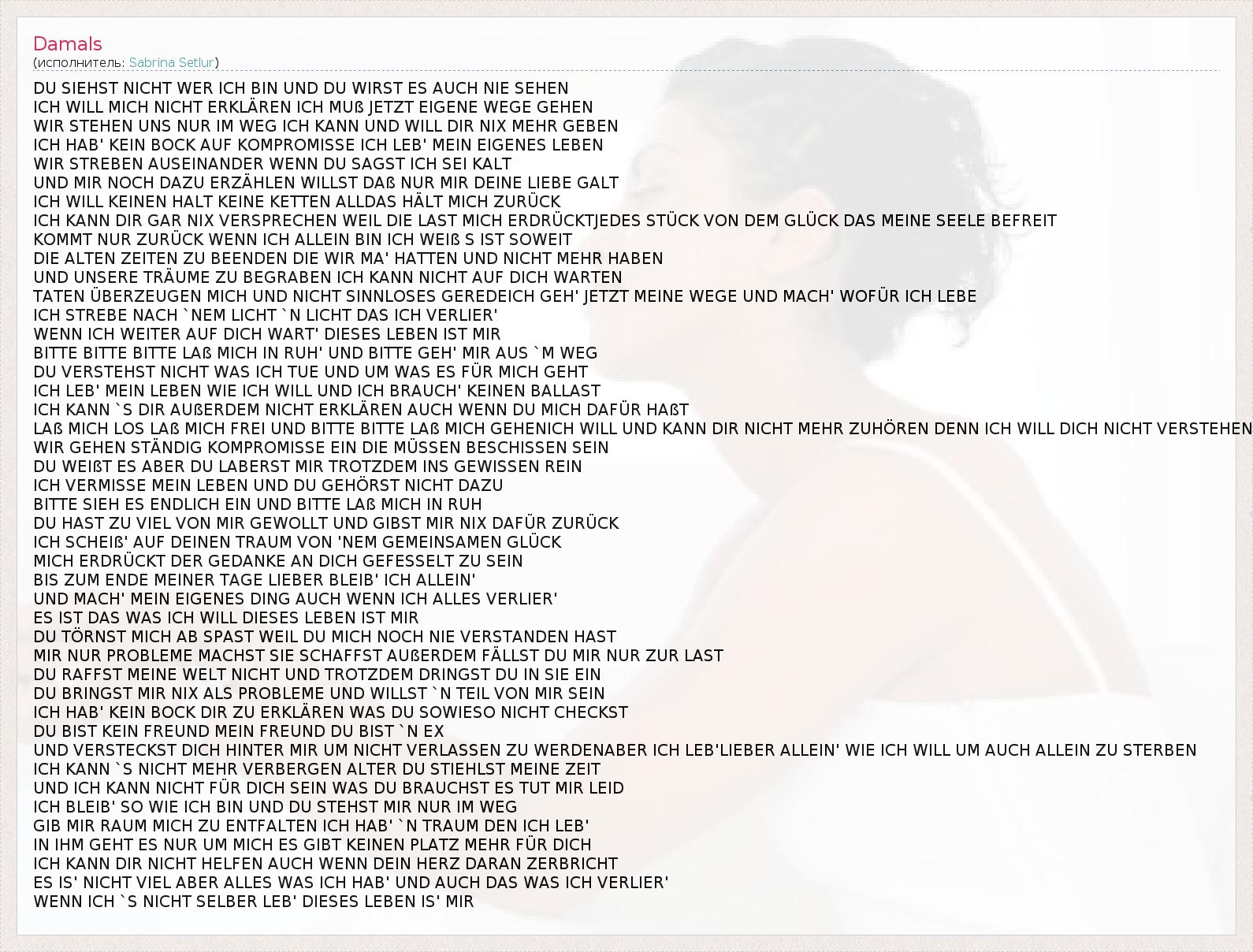 UND VERSTECKST DICH HINTER MIR UM NICHT VERLASSEN ZU WERDENABER ICH LEB'LIEBER ALLEIN' WIE ICH WILL UM AUCH ALLEIN ZU STERBEN