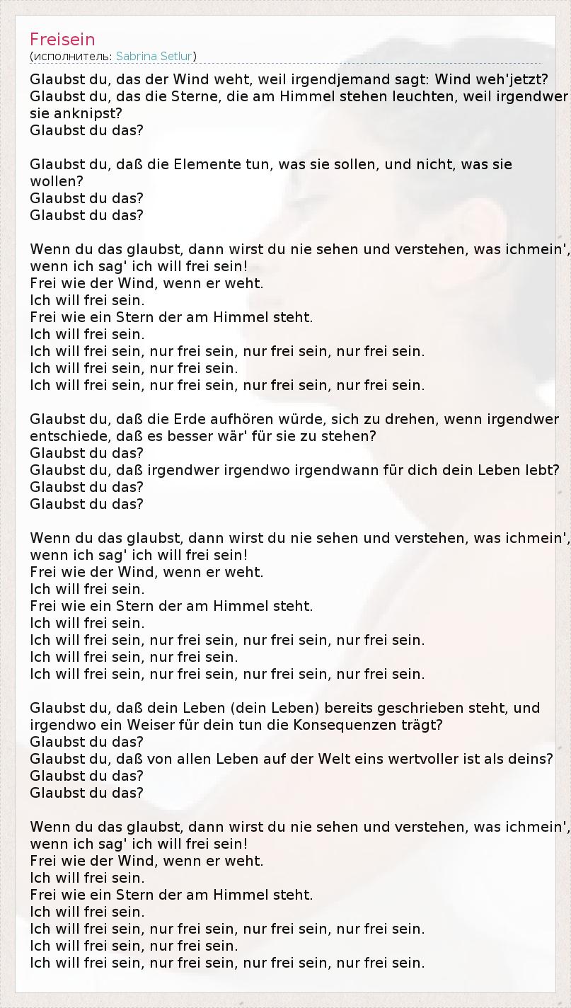 Glaubst du, das der Wind weht, weil irgendjemand sagt: Wind weh'jetzt? Glaubst du, das die Sterne, die am Himmel stehen leuchten, weil irgendwer sie anknipst? Glaubst du das? Glaubst du, daß die Elemente tun, was sie sollen, und nicht, was sie wollen? Glaubst du das? Glaubst du das? Wenn du das glaubst, dann wirst du nie sehen und verstehen, was ichmein', wenn ich sag' ich will frei sein! Frei wie der Wind, wenn er weht. Ich will frei sein. Frei wie ein Stern der am Himmel steht. Ich will frei sein. Ich will frei sein, nur frei sein, nur frei sein, nur frei sein. Ich will frei sein, nur frei sein. Ich will frei sein, nur frei sein, nur frei sein, nur frei sein. Glaubst du, daß die Erde aufhören würde, sich zu drehen, wenn irgendwer entschiede, daß es besser wär' für sie zu stehen? Glaubst du das? Glaubst du, daß irgendwer irgendwo irgendwann für dich dein Leben lebt? Glaubst du das? Glaubst du das? Wenn du das glaubst, dann wirst du nie sehen und verstehen, was ichmein', wenn ich sag' ich will frei sein! Frei wie der Wind, wenn er weht. Ich will frei sein. Frei wie ein Stern der am Himmel steht. Ich will frei sein. Ich will frei sein, nur frei sein, nur frei sein, nur frei sein. Ich will frei sein, nur frei sein. Ich will frei sein, nur frei sein, nur frei sein, nur frei sein. Glaubst du, daß dein Leben (dein Leben) bereits geschrieben steht, und irgendwo ein Weiser für dein tun die Konsequenzen trägt? Glaubst du das? Glaubst du, daß von allen Leben auf der Welt eins wertvoller ist als deins? Glaubst du das? Glaubst du das? Wenn du das glaubst, dann wirst du nie sehen und verstehen, was ichmein', wenn ich sag' ich will frei sein! Frei wie der Wind, wenn er weht. Ich will frei sein. Frei wie ein Stern der am Himmel steht. Ich will frei sein. Ich will frei sein, nur frei sein, nur frei sein, nur frei sein. Ich will frei sein, nur frei sein. Ich will frei sein, nur frei sein, nur frei sein, nur frei sein.