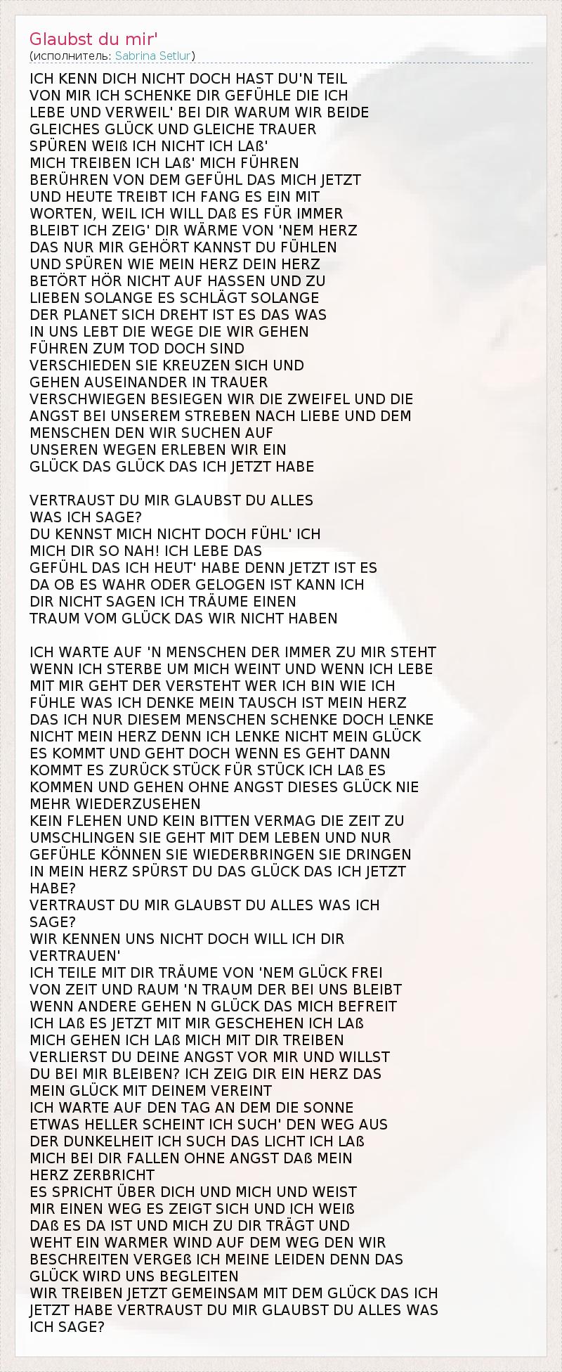 ICH KENN DICH NICHT DOCH HAST DU'N TEIL VON MIR ICH SCHENKE DIR GEFÜHLE DIE ICH LEBE UND VERWEIL' BEI DIR WARUM WIR BEIDE GLEICHES GLÜCK UND GLEICHE TRAUER SPÜREN WEIß ICH NICHT ICH LAß' MICH TREIBEN ICH LAß' MICH FÜHREN BERÜHREN VON DEM GEFÜHL DAS MICH JETZT UND HEUTE TREIBT ICH FANG ES EIN MIT WORTEN, WEIL ICH WILL DAß ES FÜR IMMER BLEIBT ICH ZEIG' DIR WÄRME VON 'NEM HERZ DAS NUR MIR GEHÖRT KANNST DU FÜHLEN UND SPÜREN WIE MEIN HERZ DEIN HERZ BETÖRT HÖR NICHT AUF HASSEN UND ZU LIEBEN SOLANGE ES SCHLÄGT SOLANGE DER PLANET SICH DREHT IST ES DAS WAS IN UNS LEBT DIE WEGE DIE WIR GEHEN FÜHREN ZUM TOD DOCH SIND VERSCHIEDEN SIE KREUZEN SICH UND GEHEN AUSEINANDER IN TRAUER VERSCHWIEGEN BESIEGEN WIR DIE ZWEIFEL UND DIE ANGST BEI UNSEREM STREBEN NACH LIEBE UND DEM MENSCHEN DEN WIR SUCHEN AUF UNSEREN WEGEN ERLEBEN WIR EIN GLÜCK DAS GLÜCK DAS ICH JETZT HABE VERTRAUST DU MIR GLAUBST DU ALLES WAS ICH SAGE? DU KENNST MICH NICHT DOCH FÜHL' ICH MICH DIR SO NAH! ICH LEBE DAS GEFÜHL DAS ICH HEUT' HABE DENN JETZT IST ES DA OB ES WAHR ODER GELOGEN IST KANN ICH DIR NICHT SAGEN ICH TRÄUME EINEN TRAUM VOM GLÜCK DAS WIR NICHT HABEN ICH WARTE AUF 'N MENSCHEN DER IMMER ZU MIR STEHT WENN ICH STERBE UM MICH WEINT UND WENN ICH LEBE MIT MIR GEHT DER VERSTEHT WER ICH BIN WIE ICH FÜHLE WAS ICH DENKE MEIN TAUSCH IST MEIN HERZ DAS ICH NUR DIESEM MENSCHEN SCHENKE DOCH LENKE NICHT MEIN HERZ DENN ICH LENKE NICHT MEIN GLÜCK ES KOMMT UND GEHT DOCH WENN ES GEHT DANN KOMMT ES ZURÜCK STÜCK FÜR STÜCK ICH LAß ES KOMMEN UND GEHEN OHNE ANGST DIESES GLÜCK NIE MEHR WIEDERZUSEHEN KEIN FLEHEN UND KEIN BITTEN VERMAG DIE ZEIT ZU UMSCHLINGEN SIE GEHT MIT DEM LEBEN UND NUR GEFÜHLE KÖNNEN SIE WIEDERBRINGEN SIE DRINGEN IN MEIN HERZ SPÜRST DU DAS GLÜCK DAS ICH JETZT HABE? VERTRAUST DU MIR GLAUBST DU ALLES WAS ICH SAGE? WIR KENNEN UNS NICHT DOCH WILL ICH DIR VERTRAUEN' ICH TEILE MIT DIR TRÄUME VON 'NEM GLÜCK FREI VON ZEIT UND RAUM 'N TRAUM DER BEI UNS BLEIBT WENN ANDERE GEHEN N GLÜCK DAS MICH BEFREIT ICH LAß ES JETZT MIT MIR GESCHEHEN ICH LAß MICH GEHEN ICH LAß MICH MIT DIR TREIBEN VERLIERST DU DEINE ANGST VOR MIR UND WILLST DU BEI MIR BLEIBEN? ICH ZEIG DIR EIN HERZ DAS MEIN GLÜCK MIT DEINEM VEREINT ICH WARTE AUF DEN TAG AN DEM DIE SONNE ETWAS HELLER SCHEINT ICH SUCH' DEN WEG AUS DER DUNKELHEIT ICH SUCH DAS LICHT ICH LAß MICH BEI DIR FALLEN OHNE ANGST DAß MEIN HERZ ZERBRICHT ES SPRICHT ÜBER DICH UND MICH UND WEIST MIR EINEN WEG ES ZEIGT SICH UND ICH WEIß DAß ES DA IST UND MICH ZU DIR TRÄGT UND WEHT EIN WARMER WIND AUF DEM WEG DEN WIR BESCHREITEN VERGEß ICH MEINE LEIDEN DENN DAS GLÜCK WIRD UNS BEGLEITEN WIR TREIBEN JETZT GEMEINSAM MIT DEM GLÜCK DAS ICH JETZT HABE VERTRAUST DU MIR GLAUBST DU ALLES WAS ICH SAGE?