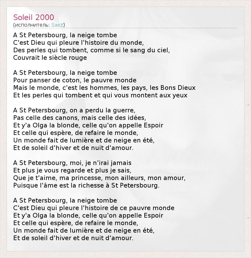 A St Petersbourg, la neige tombe C'est Dieu qui pleure l'histoire du monde, Des perles qui tombent, comme si le sang du ciel, Couvrait le siècle rouge A St Petersbourg, la neige tombe Pour panser de coton, le pauvre monde Mais le monde, c'est les hommes, les pays, les Bons Dieux Et les perles qui tombent et qui vous montent aux yeux A St Petersbourg, on a perdu la guerre, Pas celle des canons, mais celle des idées, Et y'a Olga la blonde, celle qu'on appelle Espoir Et celle qui espère, de refaire le monde, Un monde fait de lumière et de neige en été, Et de soleil d'hiver et de nuit d'amour. A St Petersbourg, moi, je n'irai jamais Et plus je vous regarde et plus je sais, Que je t'aime, ma princesse, mon ailleurs, mon amour, Puisque l'âme est la richesse à St Petersbourg. A St Petersbourg, la neige tombe C'est Dieu qui pleure l'histoire de ce pauvre monde Et y'a Olga la blonde, celle qu'on appelle Espoir Et celle qui espère, de refaire le monde, Un monde fait de lumière et de neige en été, Et de soleil d'hiver et de nuit d'amour.