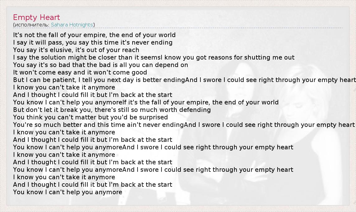 You know I can't help you anymoreAnd I swore I could see right through your empty heart