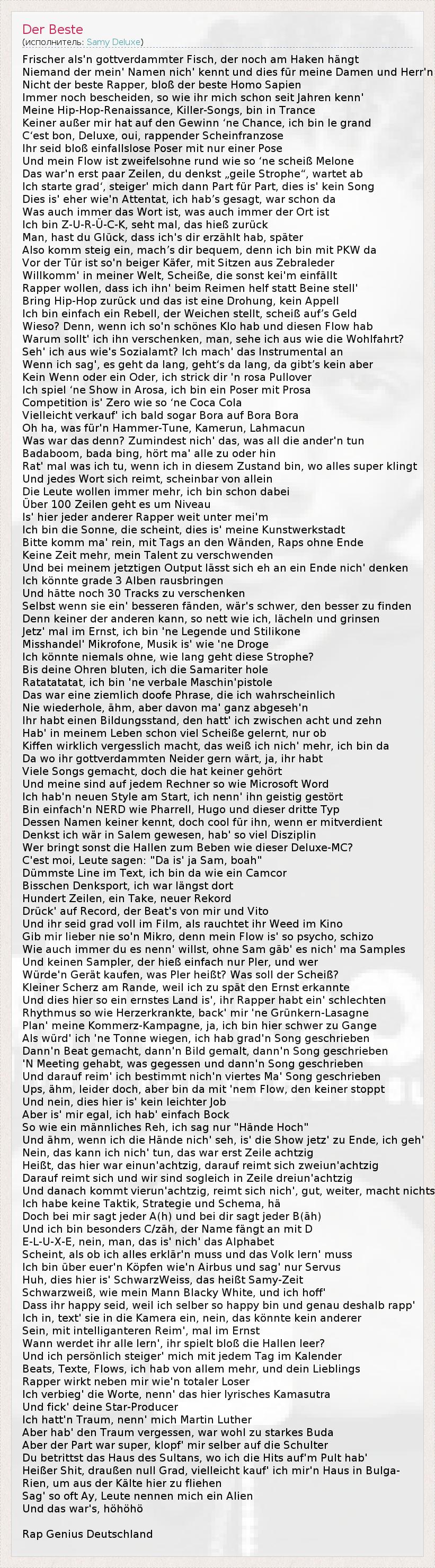 Это интересно:В 1997 году в Гамбурге, ФРГ, с выходом первой демо кассеты из серии Eimsbush Tapes начинается история одного из ярчайших немецкоговорящих МС Samy Deluxe. Эта кассета, разошедшаяся тиражом 10 тысяч экземпляров, содержала 8 песен группы Dynamite Deluxe, состоявшей из МС Сэмми Делюкса, диджея DJ Dynamite и битмейкера Tropf. Во многом эта кассета была большим прорывом в немецком хип-хопе и одновременно послужила началом... продолжение