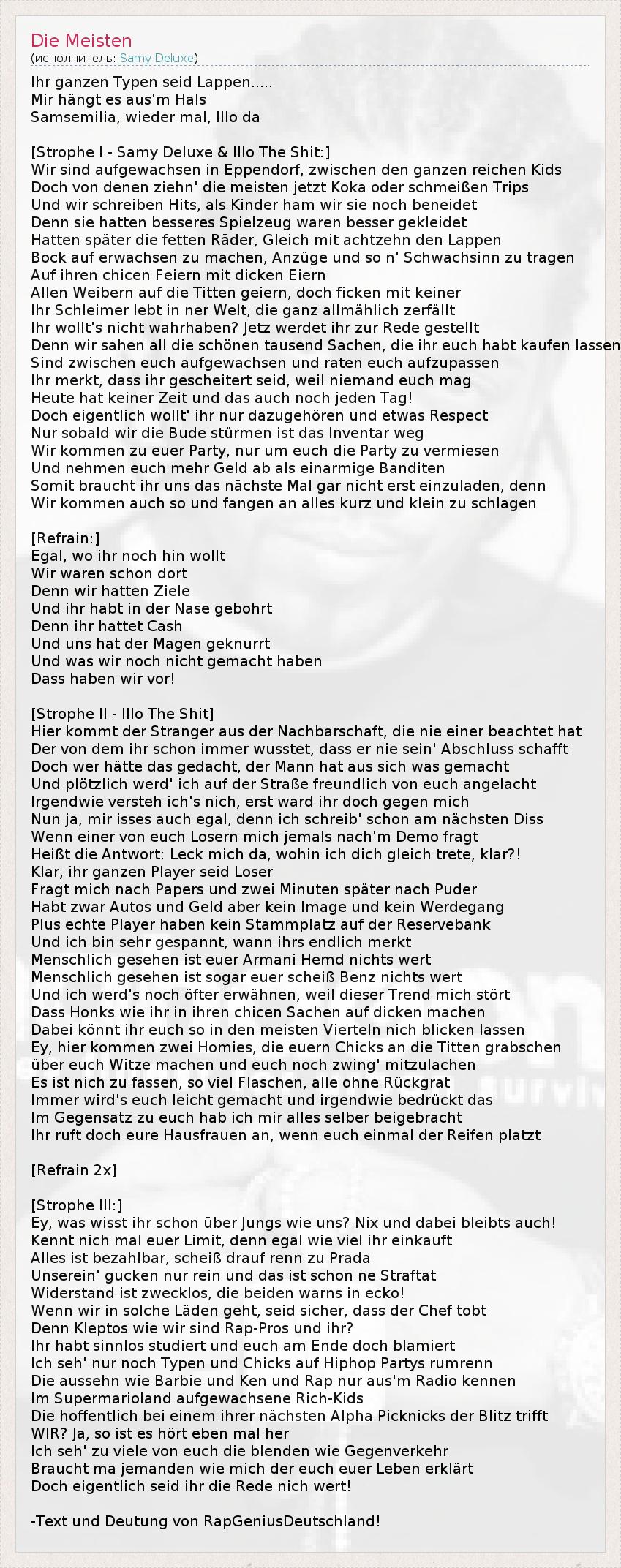 Ihr ganzen Typen seid Lappen..... Mir hängt es aus'm Hals Samsemilia, wieder mal, Illo da [Strophe I - Samy Deluxe & Illo The Shit:] Wir sind aufgewachsen in Eppendorf, zwischen den ganzen reichen Kids Doch von denen ziehn' die meisten jetzt Koka oder schmeißen Trips Und wir schreiben Hits, als Kinder ham wir sie noch beneidet Denn sie hatten besseres Spielzeug waren besser gekleidet Hatten später die fetten Räder, Gleich mit achtzehn den Lappen Bock auf erwachsen zu machen, Anzüge und so n' Schwachsinn zu tragen Auf ihren chicen Feiern mit dicken Eiern Allen Weibern auf die Titten geiern, doch ficken mit keiner Ihr Schleimer lebt in ner Welt, die ganz allmählich zerfällt Ihr wollt's nicht wahrhaben? Jetz werdet ihr zur Rede gestellt Denn wir sahen all die schönen tausend Sachen, die ihr euch habt kaufen lassen Sind zwischen euch aufgewachsen und raten euch aufzupassen Ihr merkt, dass ihr gescheitert seid, weil niemand euch mag Heute hat keiner Zeit und das auch noch jeden Tag! Doch eigentlich wollt' ihr nur dazugehören und etwas Respect Nur sobald wir die Bude stürmen ist das Inventar weg Wir kommen zu euer Party, nur um euch die Party zu vermiesen Und nehmen euch mehr Geld ab als einarmige Banditen Somit braucht ihr uns das nächste Mal gar nicht erst einzuladen, denn Wir kommen auch so und fangen an alles kurz und klein zu schlagen [Refrain:] Egal, wo ihr noch hin wollt Wir waren schon dort Denn wir hatten Ziele Und ihr habt in der Nase gebohrt Denn ihr hattet Cash Und uns hat der Magen geknurrt Und was wir noch nicht gemacht haben Dass haben wir vor! [Strophe II - Illo The Shit] Hier kommt der Stranger aus der Nachbarschaft, die nie einer beachtet hat Der von dem ihr schon immer wusstet, dass er nie sein' Abschluss schafft Doch wer hätte das gedacht, der Mann hat aus sich was gemacht Und plötzlich werd' ich auf der Straße freundlich von euch angelacht Irgendwie versteh ich's nich, erst ward ihr doch gegen mich Nun ja, mir isses auch egal, denn ich schreib' schon am nächsten Diss Wenn einer von euch Losern mich jemals nach'm Demo fragt Heißt die Antwort: Leck mich da, wohin ich dich gleich trete, klar?! Klar, ihr ganzen Player seid Loser Fragt mich nach Papers und zwei Minuten später nach Puder Habt zwar Autos und Geld aber kein Image und kein Werdegang Plus echte Player haben kein Stammplatz auf der Reservebank Und ich bin sehr gespannt, wann ihrs endlich merkt Menschlich gesehen ist euer Armani Hemd nichts wert Menschlich gesehen ist sogar euer scheiß Benz nichts wert Und ich werd's noch öfter erwähnen, weil dieser Trend mich stört Dass Honks wie ihr in ihren chicen Sachen auf dicken machen Dabei könnt ihr euch so in den meisten Vierteln nich blicken lassen Ey, hier kommen zwei Homies, die euern Chicks an die Titten grabschen über euch Witze machen und euch noch zwing' mitzulachen Es ist nich zu fassen, so viel Flaschen, alle ohne Rückgrat Immer wird's euch leicht gemacht und irgendwie bedrückt das Im Gegensatz zu euch hab ich mir alles selber beigebracht Ihr ruft doch eure Hausfrauen an, wenn euch einmal der Reifen platzt [Refrain 2x] [Strophe III:] Ey, was wisst ihr schon über Jungs wie uns? Nix und dabei bleibts auch! Kennt nich mal euer Limit, denn egal wie viel ihr einkauft Alles ist bezahlbar, scheiß drauf renn zu Prada Unserein' gucken nur rein und das ist schon ne Straftat Widerstand ist zwecklos, die beiden warns in ecko! Wenn wir in solche Läden geht, seid sicher, dass der Chef tobt Denn Kleptos wie wir sind Rap-Pros und ihr? Ihr habt sinnlos studiert und euch am Ende doch blamiert Ich seh' nur noch Typen und Chicks auf Hiphop Partys rumrenn Die aussehn wie Barbie und Ken und Rap nur aus'm Radio kennen Im Supermarioland aufgewachsene Rich-Kids Die hoffentlich bei einem ihrer nächsten Alpha Picknicks der Blitz trifft WIR? Ja, so ist es hört eben mal her Ich seh' zu viele von euch die blenden wie Gegenverkehr Braucht ma jemanden wie mich der euch euer Leben erklärt Doch eigentlich seid ihr die Rede nich wert! -Text und Deutung von RapGeniusDeutschland!