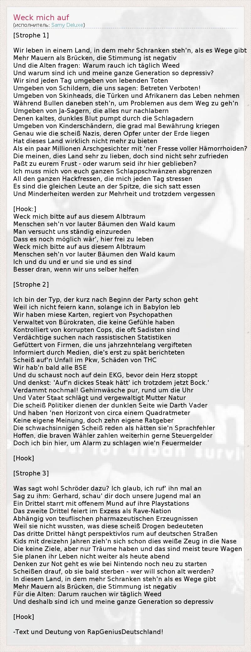 [Strophe 1] Wir leben in einem Land, in dem mehr Schranken steh'n, als es Wege gibt Mehr Mauern als Brücken, die Stimmung ist negativ Und die Alten fragen: Warum rauch ich täglich Weed Und warum sind ich und meine ganze Generation so depressiv? Wir sind jeden Tag umgeben von lebenden Toten Umgeben von Schildern, die uns sagen: Betreten Verboten! Umgeben von Skinheads, die Türken und Afrikanern das Leben nehmen Während Bullen daneben steh'n, um Problemen aus dem Weg zu geh'n Umgeben von Ja-Sagern, die alles nur nachlabern Denen kaltes, dunkles Blut pumpt durch die Schlagadern Umgeben von Kinderschändern, die grad mal Bewährung kriegen Genau wie die scheiß Nazis, deren Opfer unter der Erde liegen Hat dieses Land wirklich nicht mehr zu bieten Als ein paar Millionen Arschgesichter mit 'ner Fresse voller Hämorrhoiden? Die meinen, dies Land sehr zu lieben, doch sind nicht sehr zufrieden Paßt zu eurem Frust - oder warum seid ihr hier geblieben? Ich muss mich von euch ganzen Schlappschwänzen abgrenzen All den ganzen Hackfressen, die mich jeden Tag stressen Es sind die gleichen Leute an der Spitze, die sich satt essen Und Minderheiten werden zur Mehrheit und trotzdem vergessen [Hook:] Weck mich bitte auf aus diesem Albtraum Menschen seh'n vor lauter Bäumen den Wald kaum Man versucht uns ständig einzureden Dass es noch möglich wär', hier frei zu leben Weck mich bitte auf aus diesem Albtraum Menschen seh'n vor lauter Bäumen den Wald kaum Ich und du und er und sie und es sind Besser dran, wenn wir uns selber helfen [Strophe 2] Ich bin der Typ, der kurz nach Beginn der Party schon geht Weil ich nicht feiern kann, solange ich in Babylon leb Wir haben miese Karten, regiert von Psychopathen Verwaltet von Bürokraten, die keine Gefühle haben Kontrolliert von korrupten Cops, die oft Sadisten sind Verdächtige suchen nach rassistischen Statistiken Gefüttert von Firmen, die uns jahrzehntelang vergifteten Informiert durch Medien, die's erst zu spät berichteten Scheiß auf'n Unfall im Pkw, Schäden von THC Wir hab'n bald alle BSE Und du schaust noch auf dein EKG, bevor dein Herz stoppt Und denkst: 'Auf'n dickes Steak hätt' ich trotzdem jetzt Bock.' Verdammt nochmal! Gehirnwäsche pur, rund um die Uhr Und Vater Staat schlägt und vergewaltigt Mutter Natur Die scheiß Politiker dienen der dunklen Seite wie Darth Vader Und haben 'nen Horizont von circa einem Quadratmeter Keine eigene Meinung, doch zehn eigene Ratgeber Die schwachsinnigen Scheiß reden als hätten sie'n Sprachfehler Hoffen, die braven Wähler zahlen weiterhin gerne Steuergelder Doch ich bin hier, um Alarm zu schlagen wie'n Feuermelder [Hook] [Strophe 3] Was sagt wohl Schröder dazu? Ich glaub, ich ruf' ihn mal an Sag zu ihm: Gerhard, schau' dir doch unsere Jugend mal an Ein Drittel starrt mit offenem Mund auf ihre Playstations Das zweite Drittel feiert im Exzess als Rave-Nation Abhängig von teuflischen pharmazeutischen Erzeugnissen Weil sie nicht wussten, was diese scheiß Drogen bedeuteten Das dritte Drittel hängt perspektivlos rum auf deutschen Straßen Kids mit dreizehn Jahren zieh'n sich schon dies weiße Zeug in die Nase Die keine Ziele, aber nur Träume haben und das sind meist teure Wagen Sie planen ihr Leben nicht weiter als heute abend Denken zur Not geht es wie bei Nintendo noch neu zu starten Scheißen drauf, ob sie bald sterben - wer will schon alt werden? In diesem Land, in dem mehr Schranken steh'n als es Wege gibt Mehr Mauern als Brücken, die Stimmung ist negativ Für die Alten: Darum rauchen wir täglich Weed Und deshalb sind ich und meine ganze Generation so depressiv [Hook] -Text und Deutung von RapGeniusDeutschland!