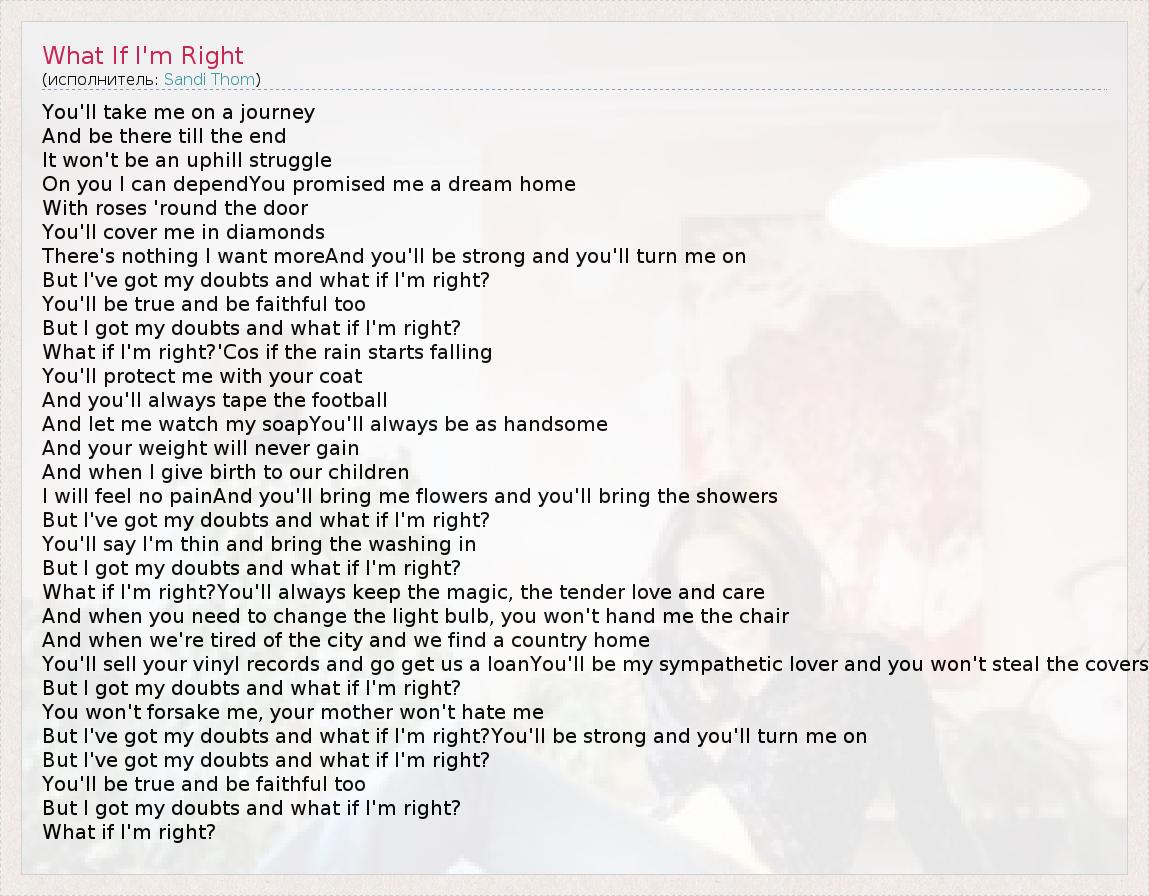 You'll take me on a journey And be there till the end It won't be an uphill struggle On you I can dependYou promised me a dream home With roses 'round the door You'll cover me in diamonds There's nothing I want moreAnd you'll be strong and you'll turn me on But I've got my doubts and what if I'm right? You'll be true and be faithful too But I got my doubts and what if I'm right? What if I'm right?'Cos if the rain starts falling You'll protect me with your coat And you'll always tape the football And let me watch my soapYou'll always be as handsome And your weight will never gain And when I give birth to our children I will feel no painAnd you'll bring me flowers and you'll bring the showers But I've got my doubts and what if I'm right? You'll say I'm thin and bring the washing in But I got my doubts and what if I'm right? What if I'm right?You'll always keep the magic, the tender love and care And when you need to change the light bulb, you won't hand me the chair And when we're tired of the city and we find a country home You'll sell your vinyl records and go get us a loanYou'll be my sympathetic lover and you won't steal the covers But I got my doubts and what if I'm right? You won't forsake me, your mother won't hate me But I've got my doubts and what if I'm right?You'll be strong and you'll turn me on But I've got my doubts and what if I'm right? You'll be true and be faithful too But I got my doubts and what if I'm right? What if I'm right?