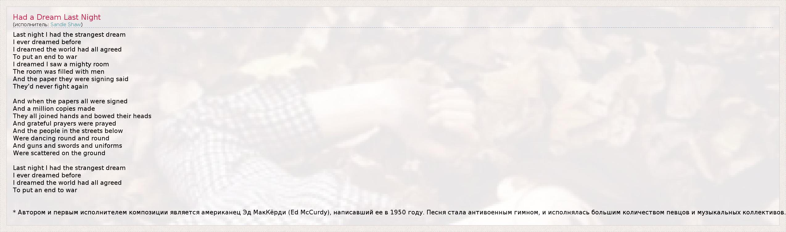 А как ты думаешь, о чем песня "Had a Dream Last Night" ?