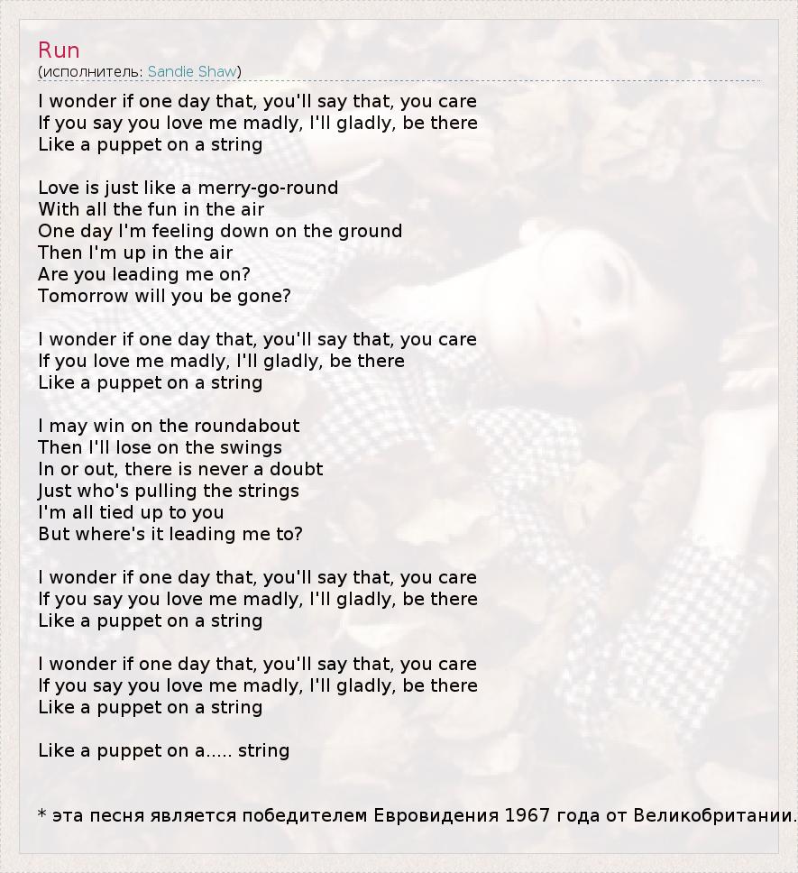 I wonder if one day that, you'll say that, you care If you say you love me madly, I'll gladly, be there Like a puppet on a string Love is just like a merry-go-round With all the fun in the air One day I'm feeling down on the ground Then I'm up in the air Are you leading me on? Tomorrow will you be gone? I wonder if one day that, you'll say that, you care If you love me madly, I'll gladly, be there Like a puppet on a string I may win on the roundabout Then I'll lose on the swings In or out, there is never a doubt Just who's pulling the strings I'm all tied up to you But where's it leading me to? I wonder if one day that, you'll say that, you care If you say you love me madly, I'll gladly, be there Like a puppet on a string I wonder if one day that, you'll say that, you care If you say you love me madly, I'll gladly, be there Like a puppet on a string Like a puppet on a..... string * эта песня является победителем Евровидения 1967 года от Великобритании.