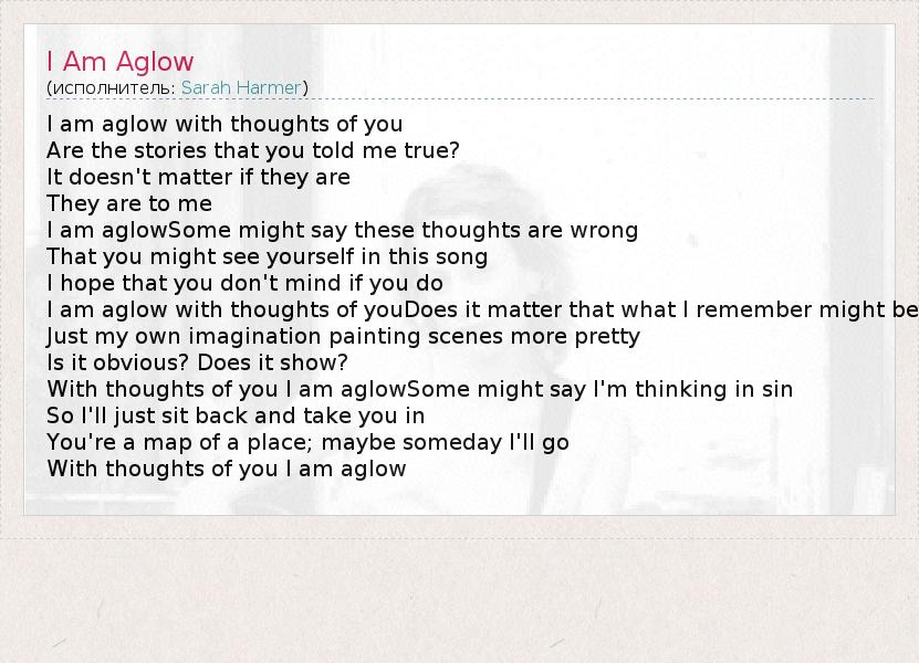 I am aglow with thoughts of you Are the stories that you told me true? It doesn't matter if they are They are to me I am aglowSome might say these thoughts are wrong That you might see yourself in this song I hope that you don't mind if you do I am aglow with thoughts of youDoes it matter that what I remember might be Just my own imagination painting scenes more pretty Is it obvious? Does it show? With thoughts of you I am aglowSome might say I'm thinking in sin So I'll just sit back and take you in You're a map of a place; maybe someday I'll go With thoughts of you I am aglow