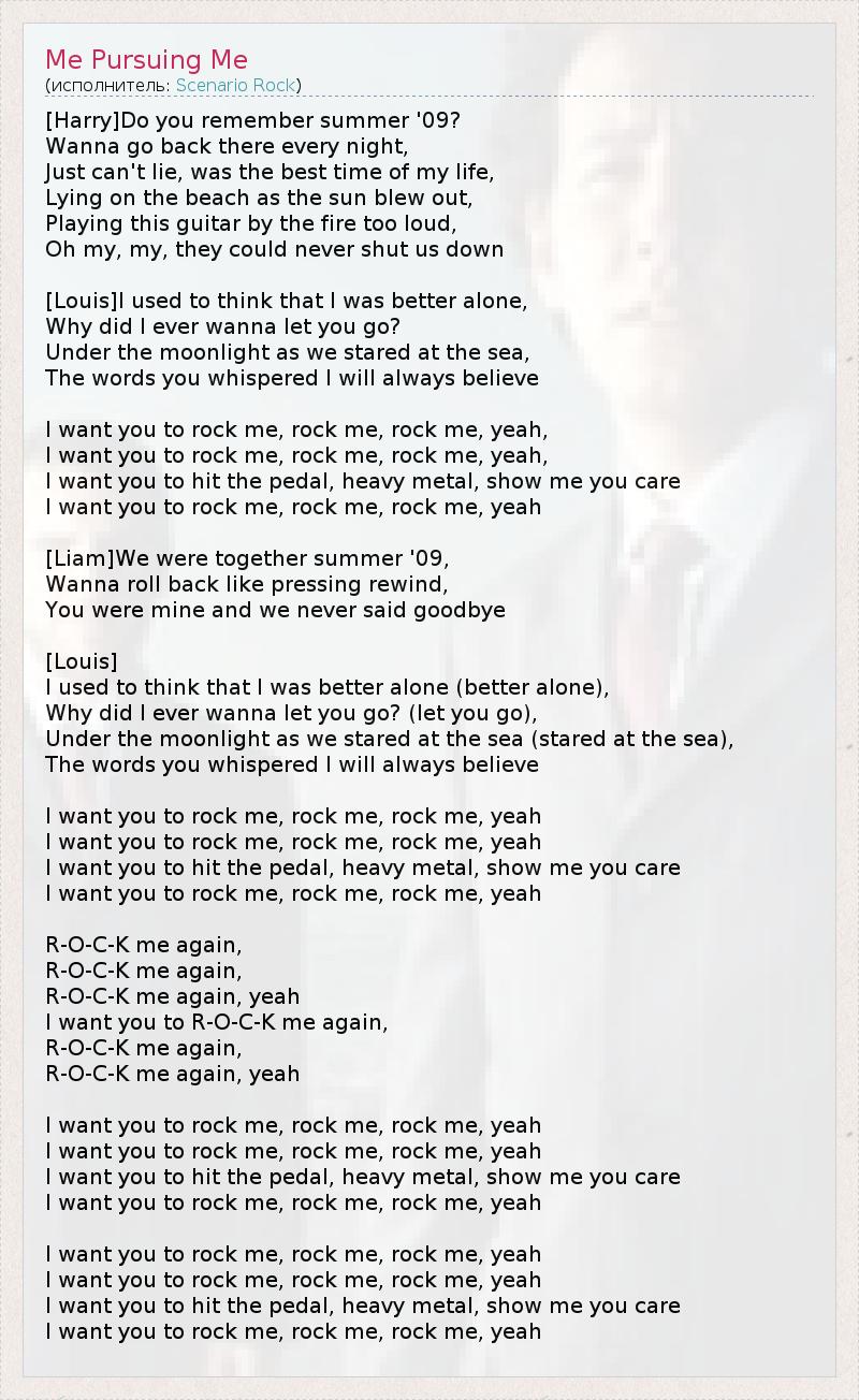 [Harry]Do you remember summer '09? Wanna go back there every night, Just can't lie, was the best time of my life, Lying on the beach as the sun blew out, Playing this guitar by the fire too loud, Oh my, my, they could never shut us down [Louis]I used to think that I was better alone, Why did I ever wanna let you go? Under the moonlight as we stared at the sea, The words you whispered I will always believe I want you to rock me, rock me, rock me, yeah, I want you to rock me, rock me, rock me, yeah, I want you to hit the pedal, heavy metal, show me you care I want you to rock me, rock me, rock me, yeah [Liam]We were together summer '09, Wanna roll back like pressing rewind, You were mine and we never said goodbye [Louis] I used to think that I was better alone (better alone), Why did I ever wanna let you go? (let you go), Under the moonlight as we stared at the sea (stared at the sea), The words you whispered I will always believe I want you to rock me, rock me, rock me, yeah I want you to rock me, rock me, rock me, yeah I want you to hit the pedal, heavy metal, show me you care I want you to rock me, rock me, rock me, yeah R-O-C-K me again, R-O-C-K me again, R-O-C-K me again, yeah I want you to R-O-C-K me again, R-O-C-K me again, R-O-C-K me again, yeah I want you to rock me, rock me, rock me, yeah I want you to rock me, rock me, rock me, yeah I want you to hit the pedal, heavy metal, show me you care I want you to rock me, rock me, rock me, yeah I want you to rock me, rock me, rock me, yeah I want you to rock me, rock me, rock me, yeah I want you to hit the pedal, heavy metal, show me you care I want you to rock me, rock me, rock me, yeah