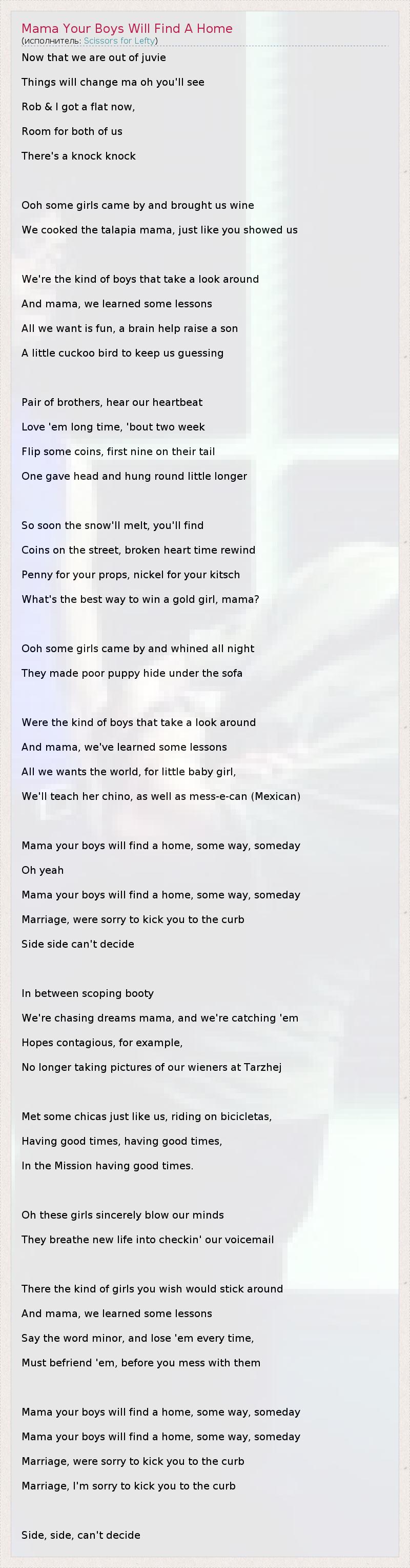 Now that we are out of juvie Things will change ma oh you'll see Rob & I got a flat now, Room for both of us There's a knock knock Ooh some girls came by and brought us wine We cooked the talapia mama, just like you showed us We're the kind of boys that take a look around And mama, we learned some lessons All we want is fun, a brain help raise a son A little cuckoo bird to keep us guessing Pair of brothers, hear our heartbeat Love 'em long time, 'bout two week Flip some coins, first nine on their tail One gave head and hung round little longer So soon the snow'll melt, you'll find Coins on the street, broken heart time rewind Penny for your props, nickel for your kitsch What's the best way to win a gold girl, mama? Ooh some girls came by and whined all night They made poor puppy hide under the sofa Were the kind of boys that take a look around And mama, we've learned some lessons All we wants the world, for little baby girl, We'll teach her chino, as well as mess-e-can (Mexican) Mama your boys will find a home, some way, someday Oh yeah Mama your boys will find a home, some way, someday Marriage, were sorry to kick you to the curb Side side can't decide In between scoping booty We're chasing dreams mama, and we're catching 'em Hopes contagious, for example, No longer taking pictures of our wieners at Tarzhej Met some chicas just like us, riding on bicicletas, Having good times, having good times, In the Mission having good times. Oh these girls sincerely blow our minds They breathe new life into checkin' our voicemail There the kind of girls you wish would stick around And mama, we learned some lessons Say the word minor, and lose 'em every time, Must befriend 'em, before you mess with them Mama your boys will find a home, some way, someday Mama your boys will find a home, some way, someday Marriage, were sorry to kick you to the curb Marriage, I'm sorry to kick you to the curb Side, side, can't decide