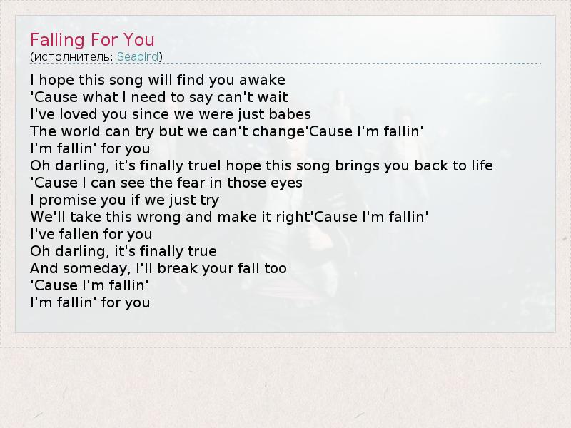 I hope this song will find you awake 'Cause what I need to say can't wait I've loved you since we were just babes The world can try but we can't change'Cause I'm fallin' I'm fallin' for you Oh darling, it's finally trueI hope this song brings you back to life 'Cause I can see the fear in those eyes I promise you if we just try We'll take this wrong and make it right'Cause I'm fallin' I've fallen for you Oh darling, it's finally true And someday, I'll break your fall too 'Cause I'm fallin' I'm fallin' for you