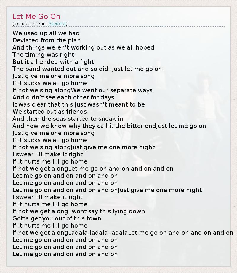 We used up all we had Deviated from the plan And things weren't working out as we all hoped The timing was right But it all ended with a fight The band wanted out and so did IJust let me go on Just give me one more song If it sucks we all go home If not we sing alongWe went our separate ways And didn't see each other for days It was clear that this just wasn't meant to be We started out as friends And then the seas started to sneak in And now we know why they call it the bitter endJust let me go on Just give me one more song If it sucks we all go home If not we sing alongJust give me one more night I swear I'll make it right If it hurts me I'll go home If not we get alongLet me go on and on and on and on Let me go on and on and on and on Let me go on and on and on and on Let me go on and on and on and onJust give me one more night I swear I'll make it right If it hurts me I'll go home If not we get alongI wont say this lying down Gotta get you out of this town If it hurts me I'll go home If not we get alongLadala-ladala-ladalaLet me go on and on and on and on Let me go on and on and on and on Let me go on and on and on and on Let me go on and on and on and on
