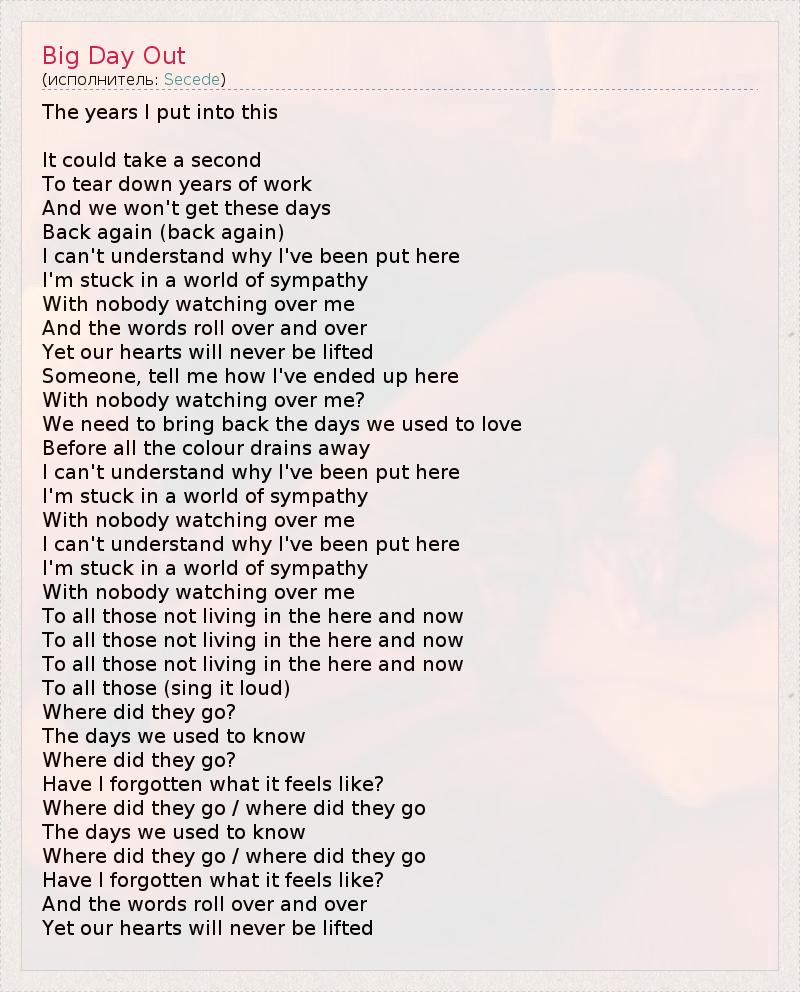 Day In Day Out (Изо Дня В День) Я потратил годы на это Можно потратить всего секунду Чтобы уничтожить года работы И мы не сможем получить эти дни обратно Обратно (обратно) Я не могу понять, почему я оказался здесь Я застрял в мире сочувствия Тем не менее на меня никто не смотрит И слова вырываются сами собой И наши сердца никогда не будут забыты Кто-нибудь, скажите мне, как я попал сюда И никто не следит за мной? Мы должны вернуть те времена, когда мы любили Пока краски окончательно не потускнели Я не могу понять, почему я оказался здесь Я застрял в мире сочувствия Тем не менее на меня никто не смотрит Я не могу понять, почему я оказался здесь Я застрял в мире сочувствия Тем не менее на меня никто не смотрит Для всех тех, кто не живет здесь и сейчас Для всех тех, кто не живет здесь и сейчас Для всех тех, кто не живет здесь и сейчас Для всех тех (пойте громче) Куда они делись? Дни, к которым мы привыкли, Куда они пропали? Разве я забыл, каково это? Куда они делись / куда они делись Дни, к которым мы привыкли Куда они делись / куда они делись Разве я забыл, каково это? И слова вырываются сами собой И наши сердца никогда не будут забыты