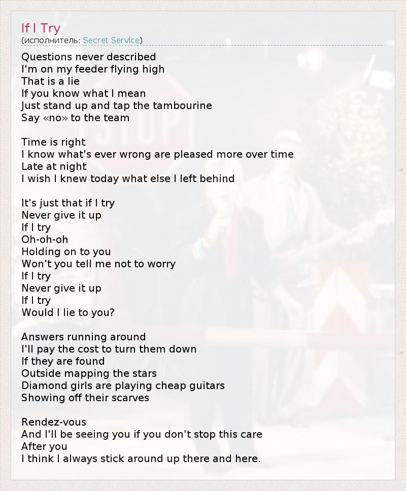 Questions never described I'm on my feeder flying high That is a lie If you know what I mean Just stand up and tap the tambourine Say «no» to the team Time is right I know what's ever wrong are pleased more over time Late at night I wish I knew today what else I left behind It's just that if I try Never give it up If I try Oh-oh-oh Holding on to you Won't you tell me not to worry If I try Never give it up If I try Would I lie to you? Answers running around I'll pay the cost to turn them down If they are found Outside mapping the stars Diamond girls are playing cheap guitars Showing off their scarves Rendez-vous And I'll be seeing you if you don't stop this care After you I think I always stick around up there and here.
