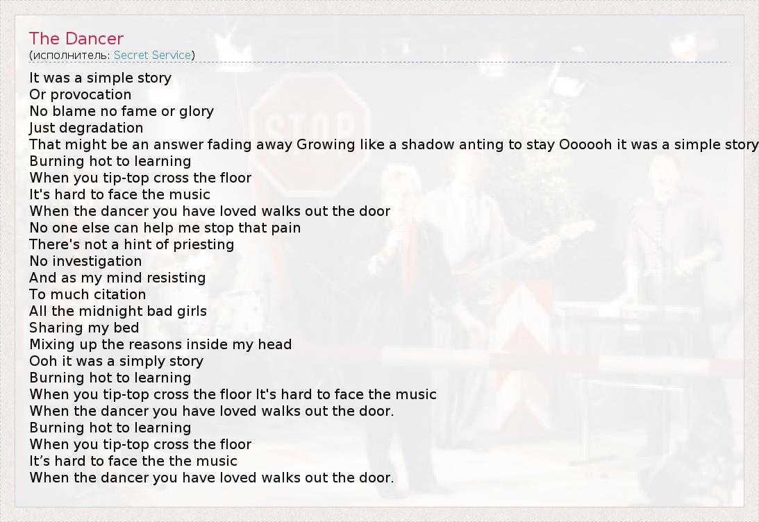 It was a simple story Or provocation No blame no fame or glory Just degradation That might be an answer fading away Growing like a shadow anting to stay Oooooh it was a simple story Burning hot to learning When you tip-top cross the floor It's hard to face the music When the dancer you have loved walks out the door No one else can help me stop that pain There's not a hint of priesting No investigation And as my mind resisting To much citation All the midnight bad girls Sharing my bed Mixing up the reasons inside my head Ooh it was a simply story Burning hot to learning When you tip-top cross the floor It's hard to face the music When the dancer you have loved walks out the door. Burning hot to learning When you tip-top cross the floor It’s hard to face the the music When the dancer you have loved walks out the door.