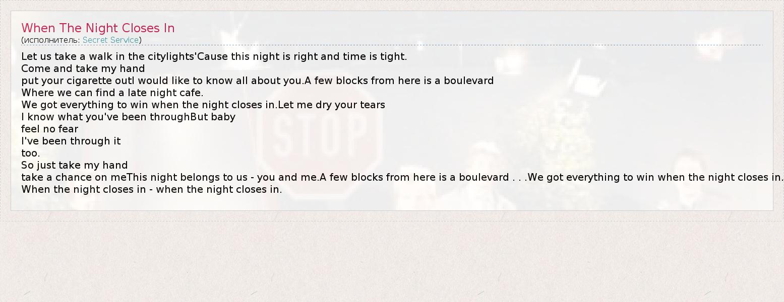 Let us take a walk in the citylights'Cause this night is right and time is tight. Come and take my hand put your cigarette outI would like to know all about you.A few blocks from here is a boulevard Where we can find a late night cafe. We got everything to win when the night closes in.Let me dry your tears I know what you've been throughBut baby feel no fear I've been through it too. So just take my hand take a chance on meThis night belongs to us - you and me.A few blocks from here is a boulevard . . .We got everything to win when the night closes in. When the night closes in - when the night closes in.