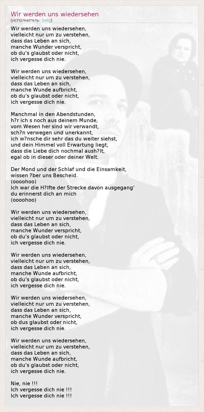 Wir werden uns wiedersehen, vielleicht nur um zu verstehen, dass das Leben an sich, manche Wunder verspricht, ob du's glaubst oder nicht, ich vergesse dich nie. Wir werden uns wiedersehen, vielleicht nur um zu verstehen, dass das Leben an sich, manche Wunde aufbricht, ob du's glaubst oder nicht, ich vergesse dich nie. Manchmal in den Abendstunden, h?r ich s noch aus deinem Munde, vom Wesen her sind wir verwandt, sch?n verwegen und unerkannt, ich w?nsche dir sehr das du weiter siehst, und dein Himmel voll Erwartung liegt, dass die Liebe dich nochmal aush?lt, egal ob in dieser oder deiner Welt. Der Mond und der Schlaf und die Einsamkeit, wissen ?ber uns Bescheid. (oooohoo) Ich war die H?lfte der Strecke davon ausgegang' du erinnerst dich an mich (oooohoo) Wir werden uns wiedersehen, vielleicht nur um zu verstehen, dass das Leben an sich, manche Wunder verspricht, ob du's glaubst oder nicht, ich vergesse dich nie. Wir werden uns wiedersehen, vielleicht nur um zu verstehen, dass das Leben an sich, manche Wunde aufbricht, ob du's glaubst oder nicht, ich vergesse dich nie. Wir werden uns wiedersehen, vielleicht nur um zu verstehen, dass das Leben an sich, manche Wunder verspricht, ob dus glaubst oder nicht, ich vergesse dich nie. Wir werden uns wiedersehen, vielleicht nur um zu verstehen, dass das Leben an sich, manche Wunde aufbricht, ob du's glaubst oder nicht, ich vergesse dich nie. Nie, nie !!! Ich vergesse dich nie !!! Ich vergesse dich nie !!!