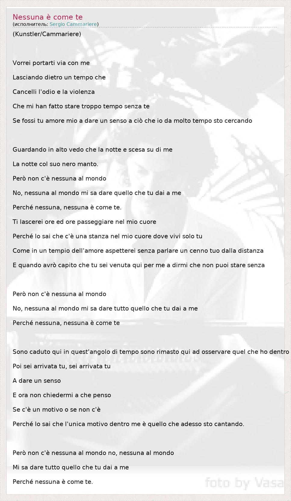(Kunstler/Cammariere) Vorrei portarti via con me Lasciando dietro un tempo che Cancelli l'odio e la violenza Che mi han fatto stare troppo tempo senza te Se fossi tu amore mio a dare un senso a ciò che io da molto tempo sto cercando Guardando in alto vedo che la notte e scesa su di me La notte col suo nero manto. Però non c'è nessuna al mondo No, nessuna al mondo mi sa dare quello che tu dai a me Perché nessuna, nessuna è come te. Ti lascerei ore ed ore passeggiare nel mio cuore Perché lo sai che c'è una stanza nel mio cuore dove vivi solo tu Come in un tempio dell'amore aspetterei senza parlare un cenno tuo dalla distanza E quando avrò capito che tu sei venuta qui per me a dirmi che non puoi stare senza Però non c'è nessuna al mondo No, nessuna al mondo mi sa dare tutto quello che tu dai a me Perché nessuna, nessuna è come te Sono caduto qui in quest'angolo di tempo sono rimasto qui ad osservare quel che ho dentro Poi sei arrivata tu, sei arrivata tu A dare un senso E ora non chiedermi a che penso Se c'è un motivo o se non c'è Perché lo sai che l'unica motivo dentro me è quello che adesso sto cantando. Però non c'è nessuna al mondo no, nessuna al mondo Mi sa dare tutto quello che tu dai a me Perché nessuna è come te.