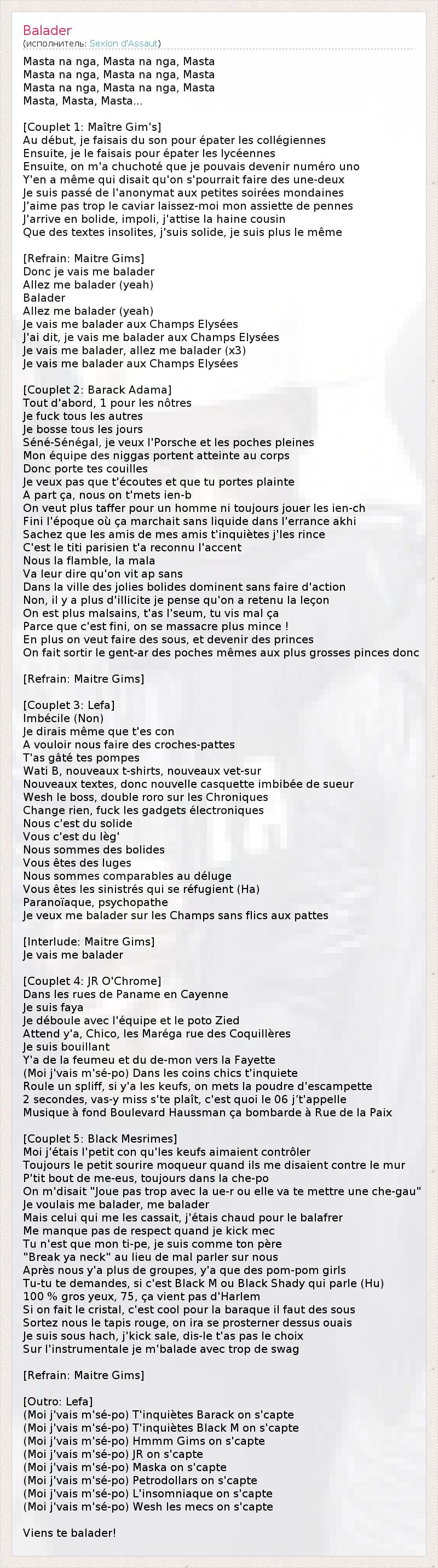 Это интересно:Группа образована в 2002 и состоит из молодежи в основном из Северной и Центральной частей Парижа. Sexion d'Assaut первоначально состояла из большого коллектива: dont Scrib-R, 75 Ness'r, Assonances (Adams Diallo, Maska и Lefa), Sar1, Assos de Salo (R-Mak и DesDes), Prototype 3015 (Maitre Gims и L.I.O.), Osiris, Bynome Lyrical, Black Mesrimes и т.д.. Такие музыканты, как Mackadam и Anraye давно связаны с Sexion d'Assaut, но в действительности никогда не были её частью.Внутри группы... продолжение