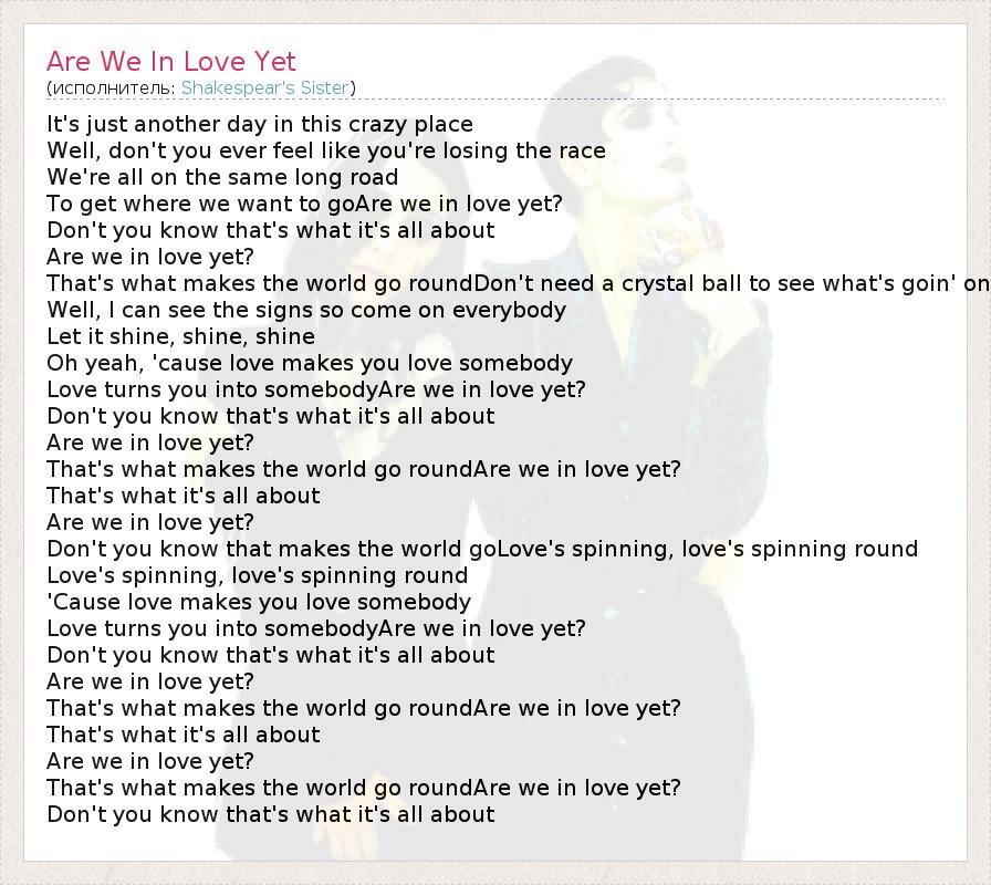 It's just another day in this crazy place Well, don't you ever feel like you're losing the race We're all on the same long road To get where we want to goAre we in love yet? Don't you know that's what it's all about Are we in love yet? That's what makes the world go roundDon't need a crystal ball to see what's goin' on Well, I can see the signs so come on everybody Let it shine, shine, shine Oh yeah, 'cause love makes you love somebody Love turns you into somebodyAre we in love yet? Don't you know that's what it's all about Are we in love yet? That's what makes the world go roundAre we in love yet? That's what it's all about Are we in love yet? Don't you know that makes the world goLove's spinning, love's spinning round Love's spinning, love's spinning round 'Cause love makes you love somebody Love turns you into somebodyAre we in love yet? Don't you know that's what it's all about Are we in love yet? That's what makes the world go roundAre we in love yet? That's what it's all about Are we in love yet? That's what makes the world go roundAre we in love yet? Don't you know that's what it's all about