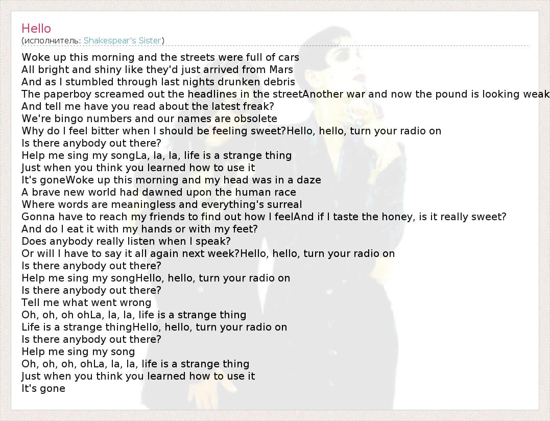 Woke up this morning and the streets were full of cars All bright and shiny like they'd just arrived from Mars And as I stumbled through last nights drunken debris The paperboy screamed out the headlines in the streetAnother war and now the pound is looking weak And tell me have you read about the latest freak? We're bingo numbers and our names are obsolete Why do I feel bitter when I should be feeling sweet?Hello, hello, turn your radio on Is there anybody out there? Help me sing my songLa, la, la, life is a strange thing Just when you think you learned how to use it It's goneWoke up this morning and my head was in a daze A brave new world had dawned upon the human race Where words are meaningless and everything's surreal Gonna have to reach my friends to find out how I feelAnd if I taste the honey, is it really sweet? And do I eat it with my hands or with my feet? Does anybody really listen when I speak? Or will I have to say it all again next week?Hello, hello, turn your radio on Is there anybody out there? Help me sing my songHello, hello, turn your radio on Is there anybody out there? Tell me what went wrong Oh, oh, oh ohLa, la, la, life is a strange thing Life is a strange thingHello, hello, turn your radio on Is there anybody out there? Help me sing my song Oh, oh, oh, ohLa, la, la, life is a strange thing Just when you think you learned how to use it It's gone
